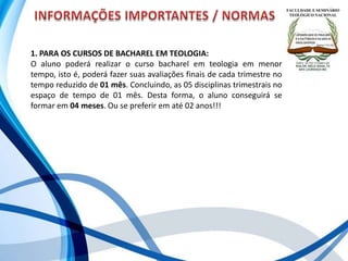 O documento descreve as regras e prazos para cursos de bacharelado, mestrado e doutorado em teologia, incluindo: