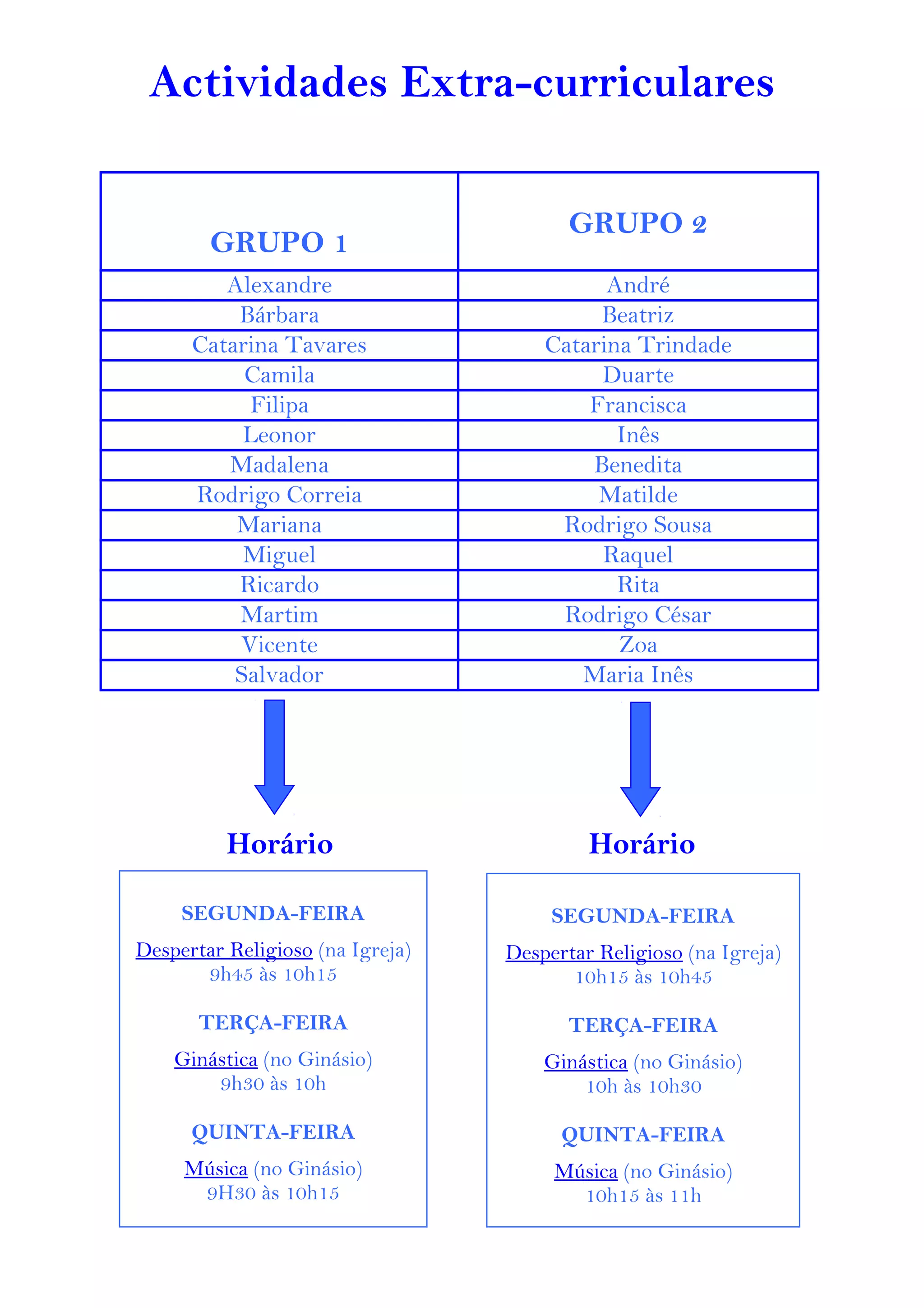O documento lista as atividades extracurriculares de duas turmas, incluindo horários para despertar religioso, ginástica e música. Também fornece instruções sobre o que trazer para as aulas de ginástica e sobre vestir a bata nesses dias.