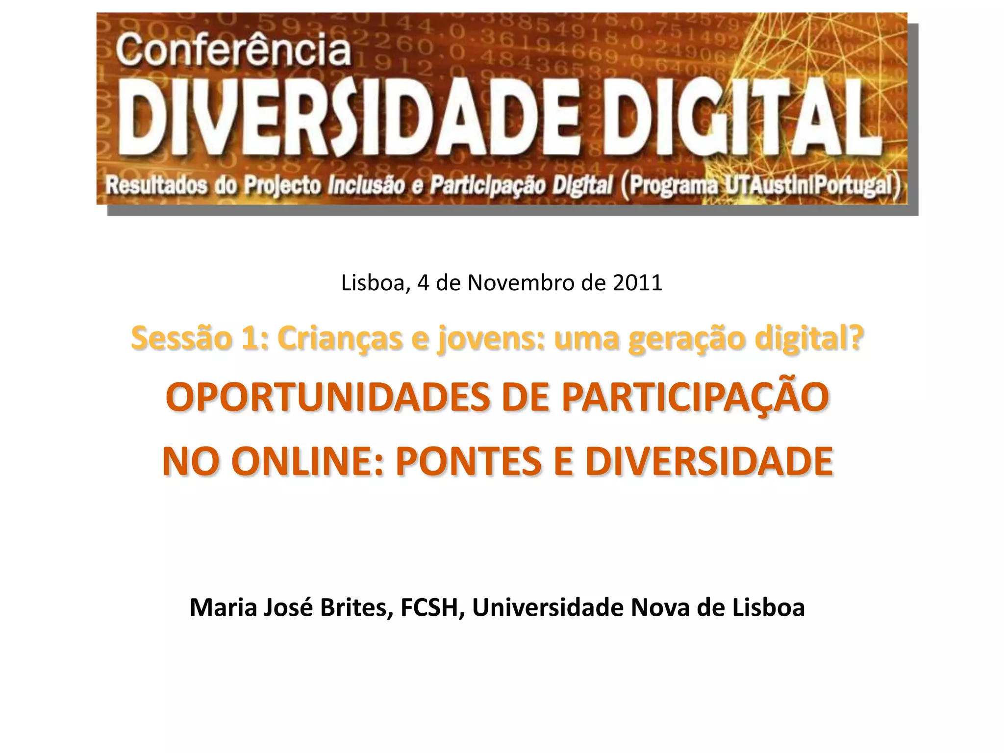 O documento discute as oportunidades de participação online de crianças e jovens, identificando dois perfis principais: 1) Um grupo com capital social e familiar acumulado que consome mais notícias; 2) Um grupo que constrói conteúdo online para expressar sua individualidade e tem menos consumo de notícias. A palestra também destaca desafios como literacias digitais diferenciadas e oportunidades de participação política não seguindo tendências de participação.
