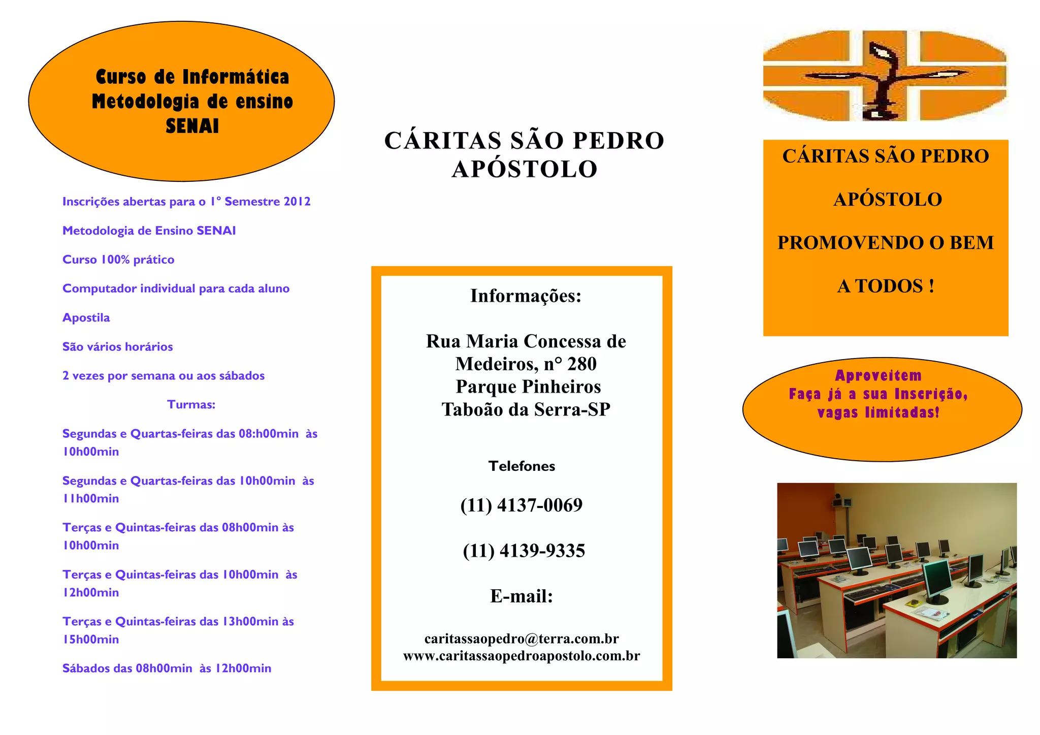 O documento anuncia as inscrições abertas para um curso de informática do SENAI com metodologia 100% prática, que terá computador individual para cada aluno e apostila. O curso ocorrerá em vários horários na semana ou aos sábados, com turmas pela manhã e tarde de segunda, quarta, terça e quinta-feira.