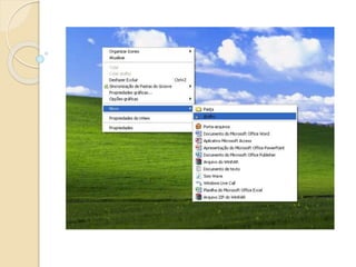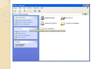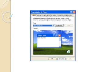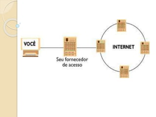 O documento descreve conceitos básicos sobre Internet e Intranet, incluindo como se conectar à Internet, navegadores, URLs, cookies, grupos de discussão, redes sociais e protocolos. Também discute conceitos do Windows XP como contas de usuário, pastas, janelas e o Windows Explorer.
