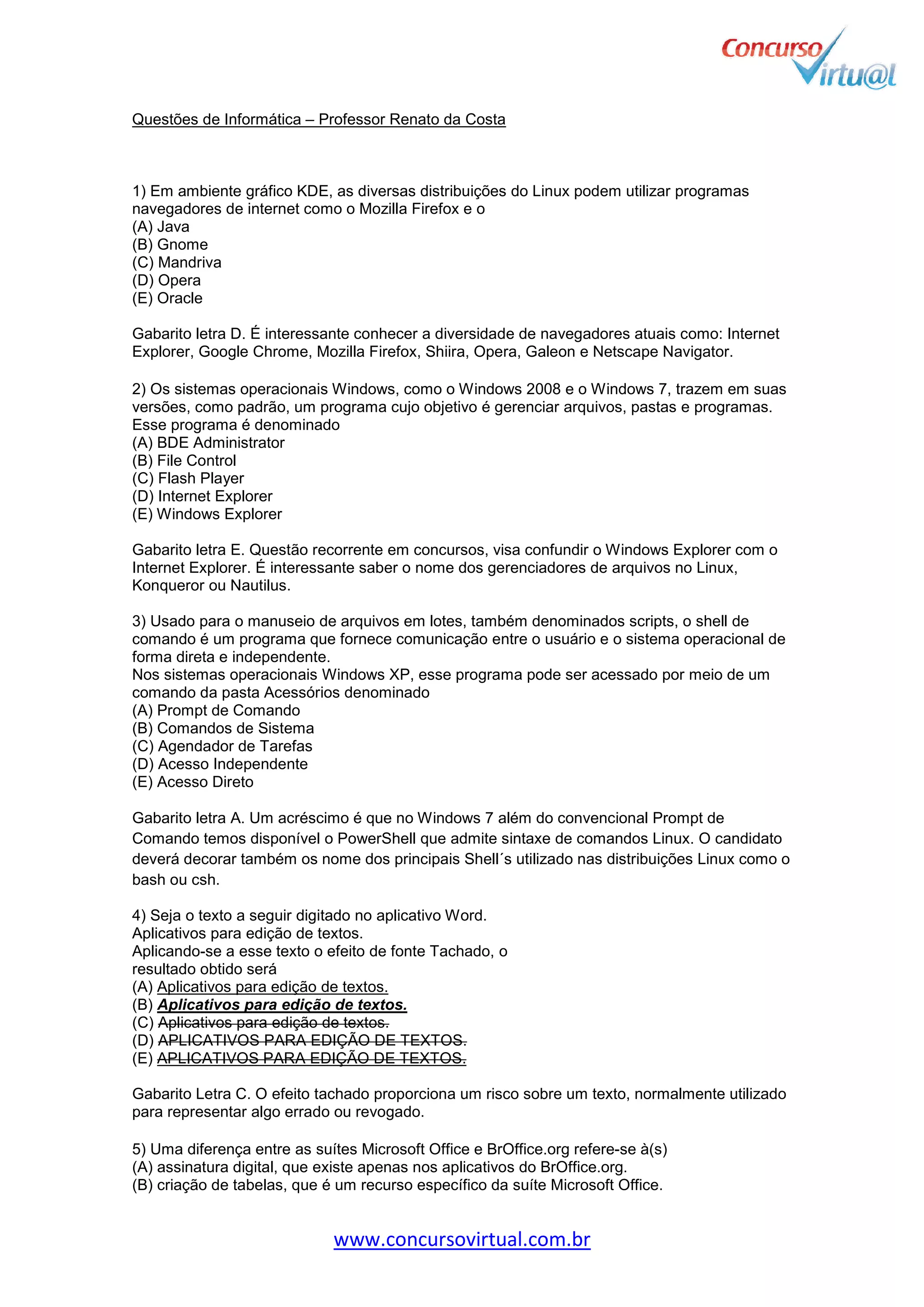 O documento contém 15 questões de informática com gabaritos sobre diversos temas como navegadores, sistemas operacionais, ferramentas de edição, segurança da informação e redes. Os gabaritos explicam de forma concisa os principais pontos abordados em cada questão.