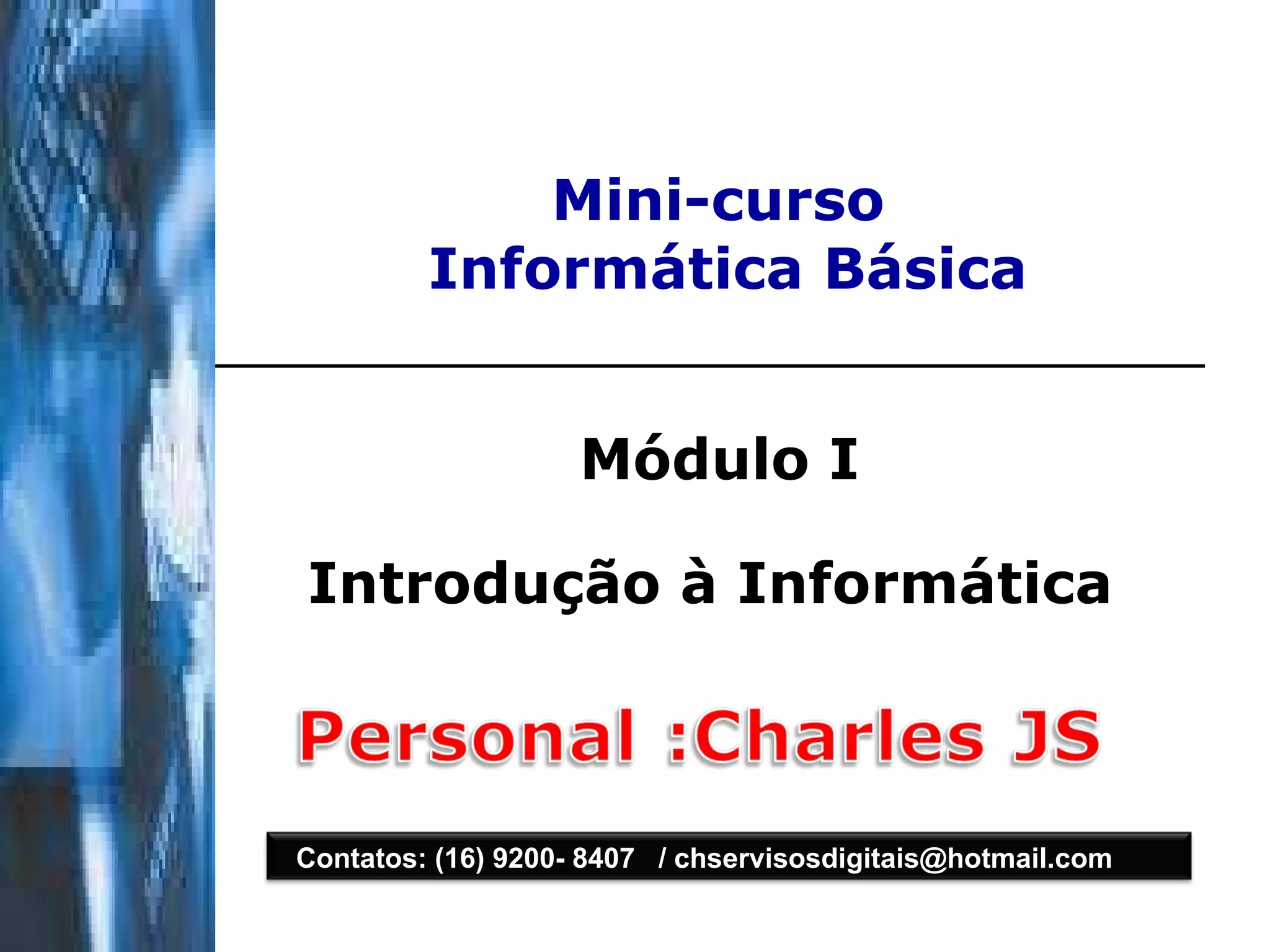 Este documento descreve um mini-curso de informática básica com 3 módulos que abordam introdução à informática, Windows e Internet. O curso tem duração de 4 horas distribuídas em 2 horas por dia e objetiva ensinar conceitos básicos de informática e ferramentas computacionais.