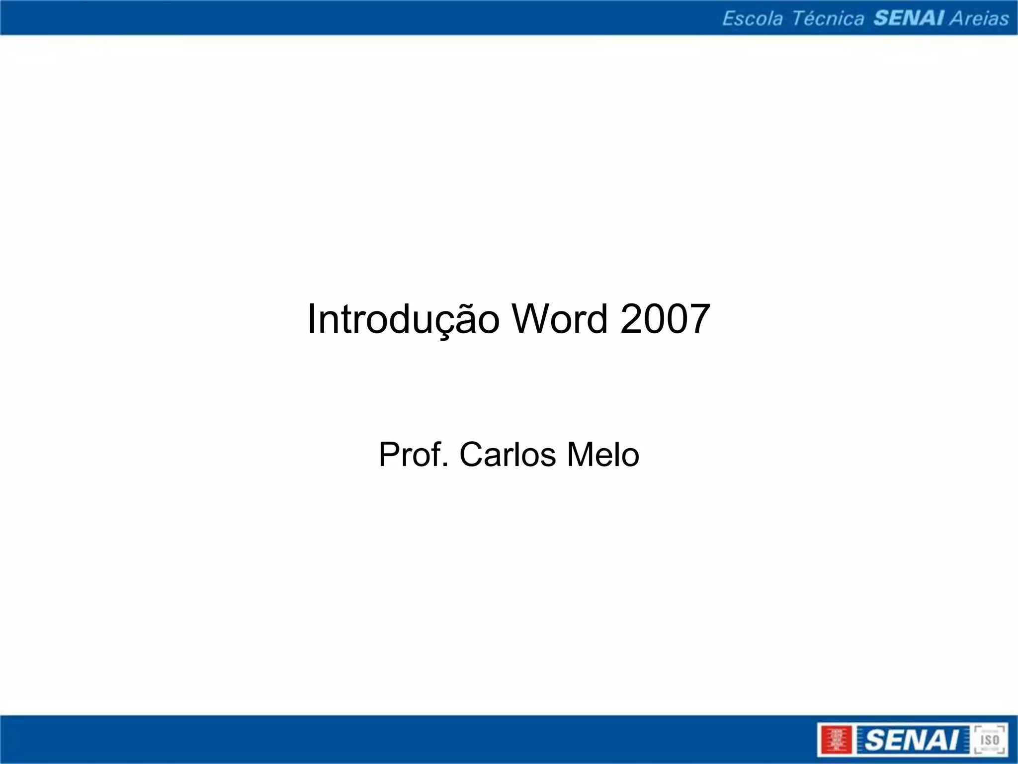 O documento fornece uma introdução ao Word 2007, explicando seus principais recursos como a faixa de opções, ponto de inserção e formatação de parágrafos. Ele também demonstra como formatar texto, mover-se pelo documento, selecionar, recortar e colar texto, e usar a barra de rolagem.