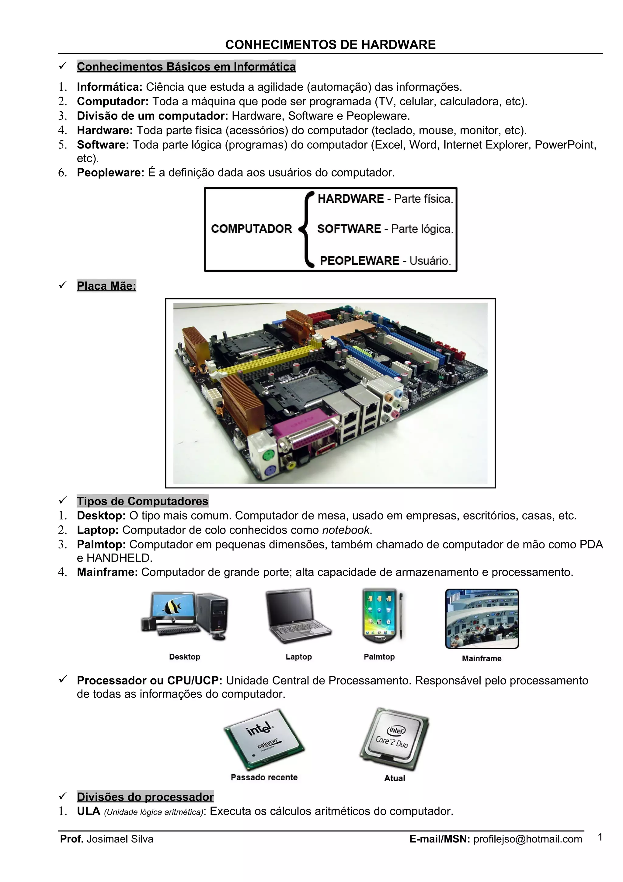 O documento fornece informações sobre hardware de computadores, incluindo seus principais componentes como placa-mãe, processador, memória e periféricos. Também define termos como bits, bytes e unidades de medida, além de explicar operações básicas como entrada, processamento, saída e armazenamento de dados.