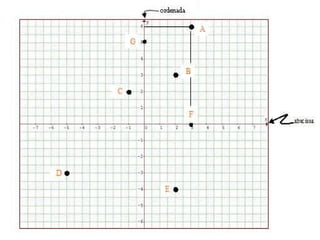 O documento descreve os conceitos básicos do plano cartesiano, incluindo os eixos x e y, quadrantes, pontos no plano representados por pares ordenados (x, y), e exemplos de pontos. Também define vários tipos de funções gráficas, como funções afim, quadrática, exponencial, logarítmica e modular.