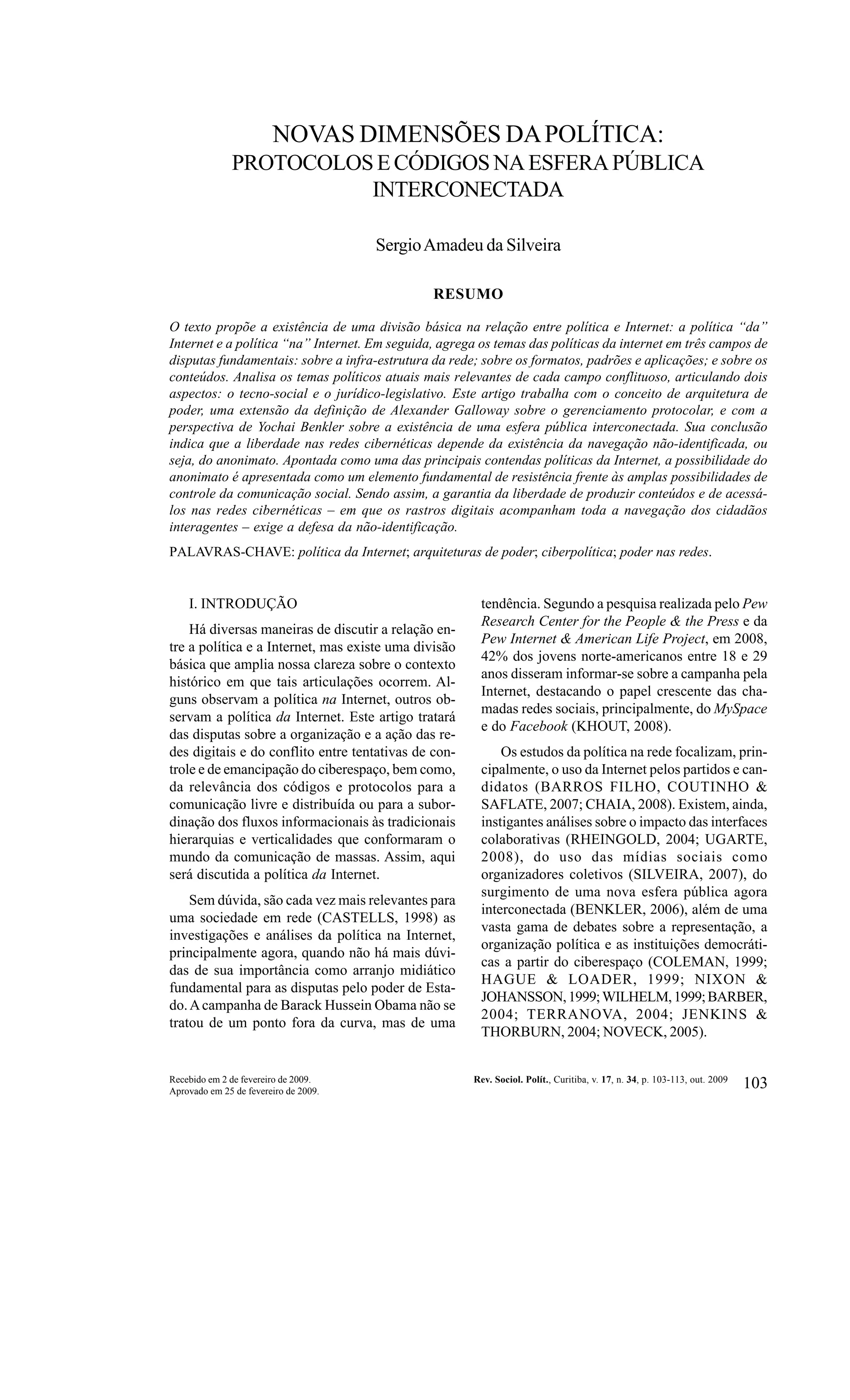Este documento discute as novas dimensões da política na esfera pública interconectada da Internet. Resume três pontos essenciais: 1) Existe uma divisão básica entre a política "da" Internet, sobre sua organização e controle, e a política "na" Internet, sobre seu uso; 2) A política da Internet envolve disputas sobre infraestrutura, formatos e conteúdos, com tentativas de controle confrontando a emancipação do ciberespaço; 3) A liberdade na Internet depende da existência do anonimato como forma de resistência aos cont