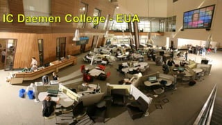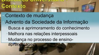 O documento discute a importância dos Information Commons (IC) nas bibliotecas universitárias. Os IC integram serviços de TI e informação, criando ambientes flexíveis que estimulam a aprendizagem colaborativa por meio do acesso a diversos recursos e tecnologias. Planejamento cuidadoso é necessário para garantir que os IC atendam às necessidades dos usuários e promovam experiências satisfatórias de aprendizagem.