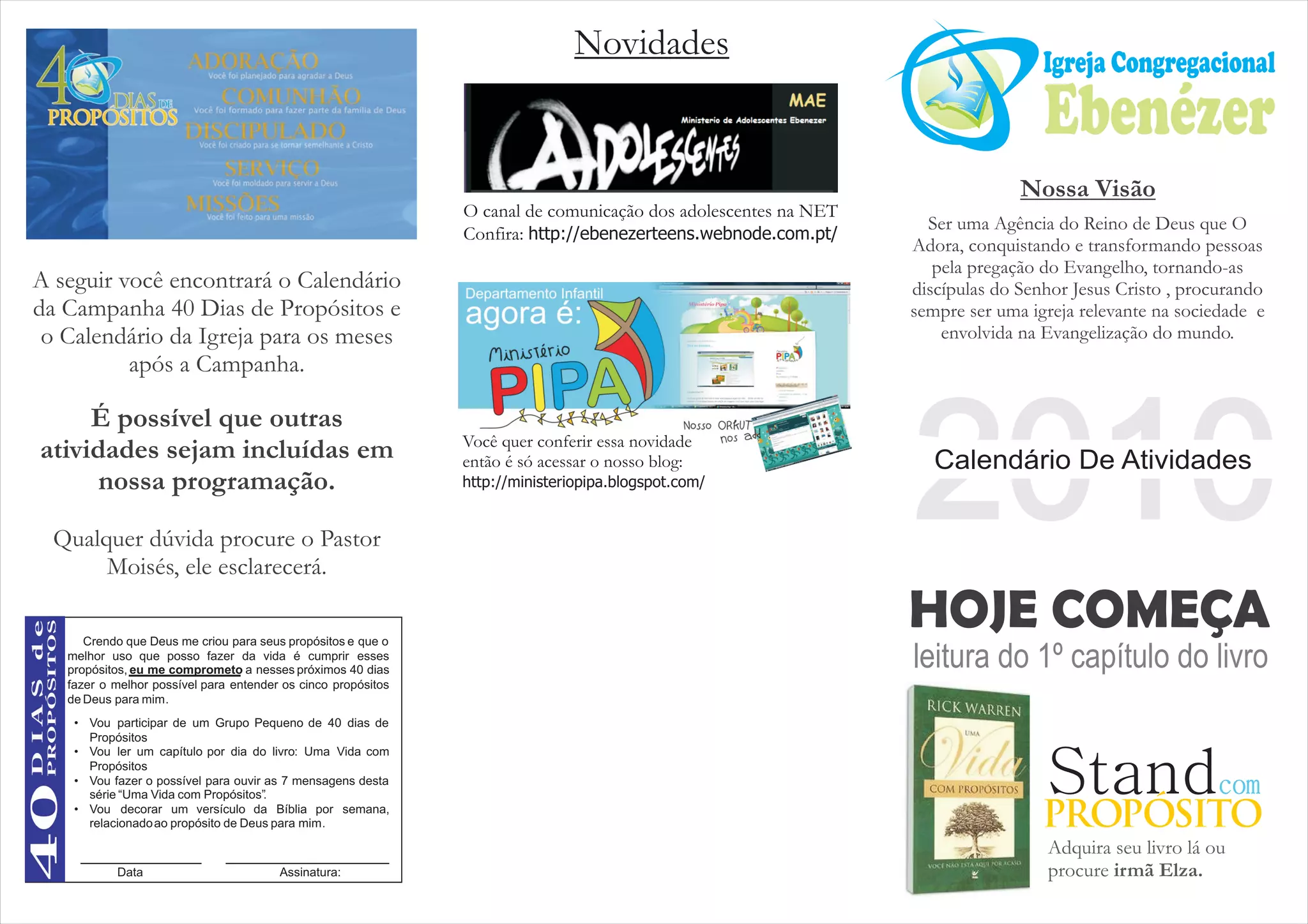 O documento apresenta o calendário de atividades da Igreja Congregacional Ebenézer para os meses de fevereiro a abril, incluindo a Campanha de 40 Dias de Propósitos com o objetivo de ajudar os membros da igreja a descobrirem os cinco propósitos eternos de Deus para suas vidas: adoração, comunhão, discipulado, serviço e missões. O pastor convida todos a participarem da campanha para crescerem espiritualmente.