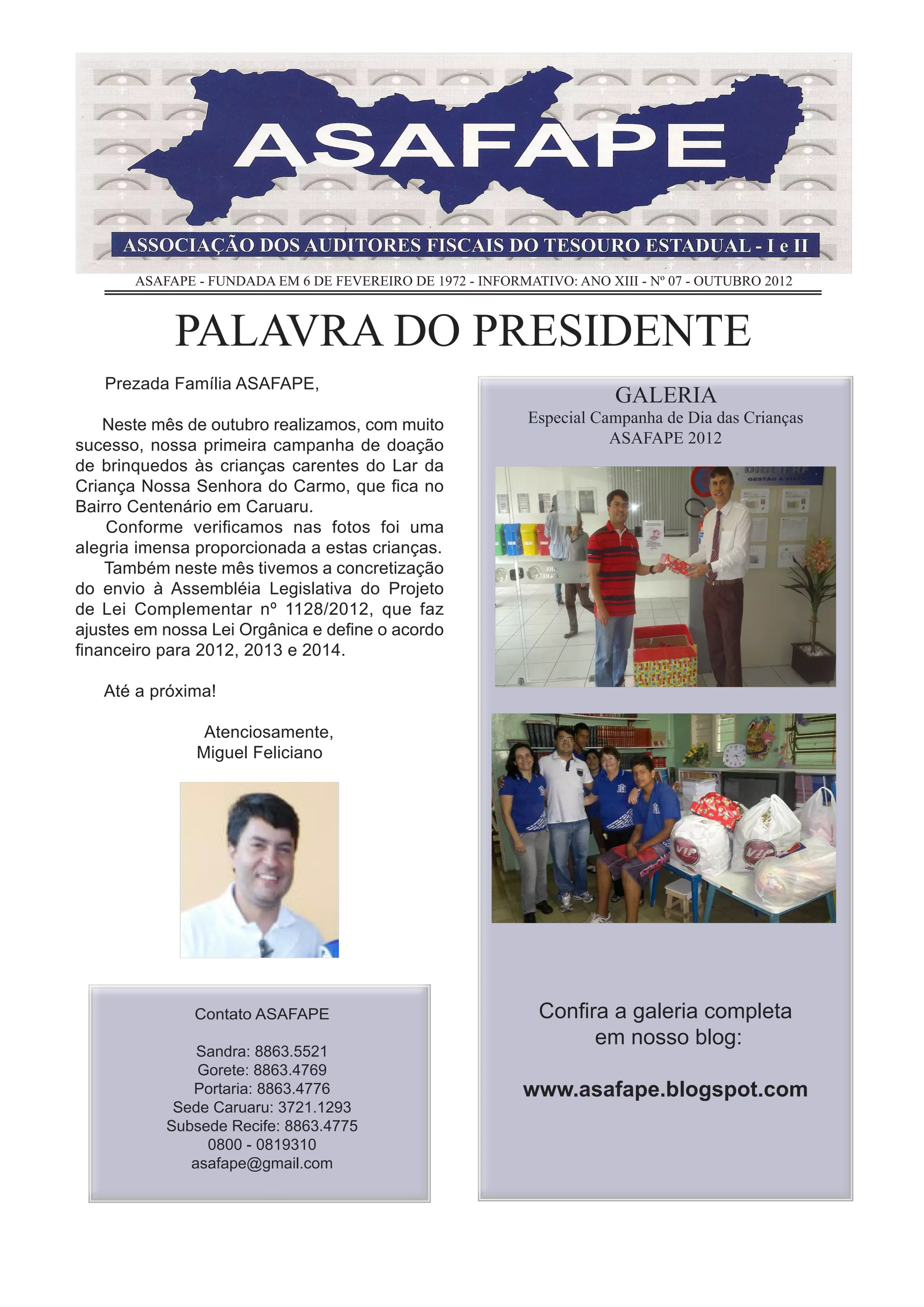 O documento resume as atividades da Associação dos Servidores da Fazenda do Estado de Pernambuco (ASAFAPE) no mês de outubro de 2012, incluindo: (1) Uma campanha de doação de brinquedos para crianças carentes, (2) O envio de um projeto de lei à Assembleia Legislativa, (3) Uma advertência sobre um golpe envolvendo supostos valores a receber.