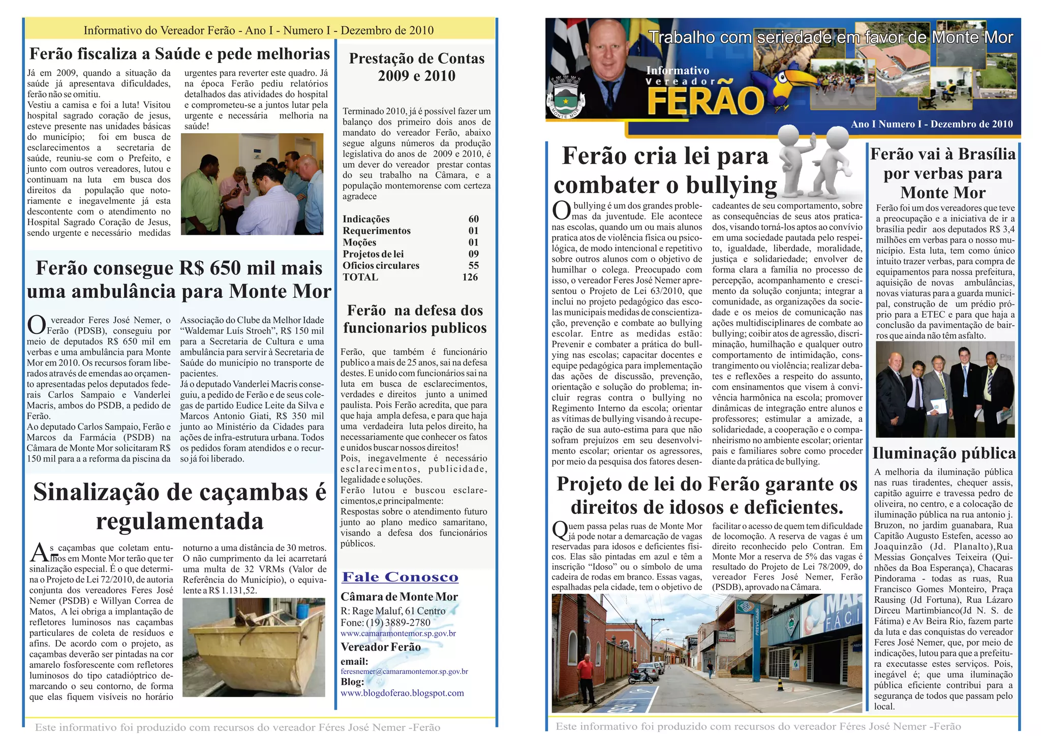 O documento resume as principais ações do vereador Ferão em defesa da saúde, educação e infraestrutura de Monte Mor nos anos de 2009 e 2010, por meio de indicações, projetos de lei e busca de verbas. Ele fiscalizou hospitais, regulamentou caçambas e casamentos comunitários, e lutou por iluminação, transporte e lazer para a população.