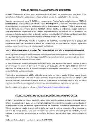 O sindicato critica a ECT por usar a PLR como barganha e pagar linearmente nos próximos 5 anos. A proposta foi recusada pelos sindicatos. A ECT lucrou R$325 milhões em 2013 mas alega que não pode pagar melhor PLR para os trabalhadores. O sindicato convocará assembleia para debater a luta pela garantia da PLR.