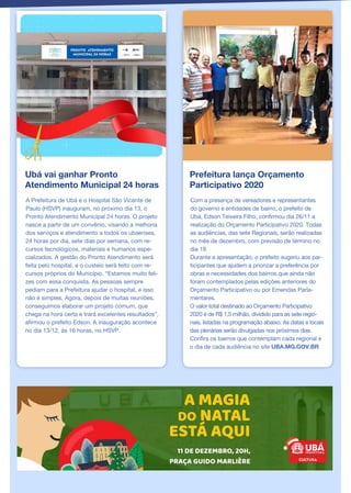 O documento resume as principais notícias de Ubá em 06 de Dezembro de 2019, incluindo: (1) A inauguração de um Pronto Atendimento Municipal 24 horas em parceria com o Hospital São Vicente de Paulo; (2) O lançamento do Orçamento Participativo de 2020, com audiências públicas em Dezembro; (3) A devolução de R$2 milhões da Câmara Municipal para os cofres da Prefeitura provenientes da otimização de gastos do Legislativo.