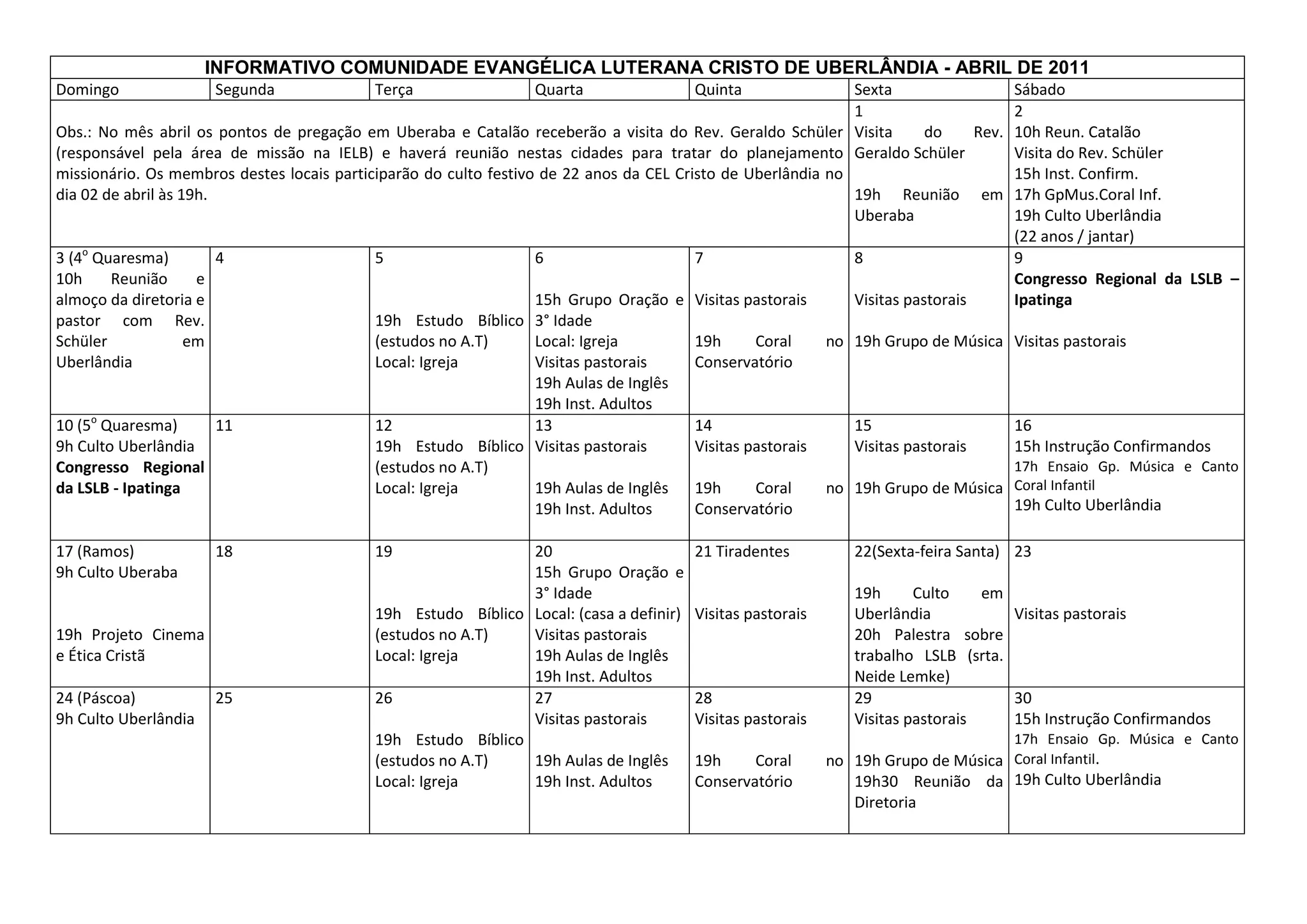 O documento apresenta a programação das atividades religiosas e comunitárias da Igreja Evangélica Luterana Cristo de Uberlândia para o mês de abril de 2011, incluindo cultos, reuniões, visitas pastorais, estudos bíblicos, aulas de inglês e coral. Destaca a visita do Rev. Geraldo Schüler no início do mês e o culto de 22 anos da igreja no dia 2 de abril.