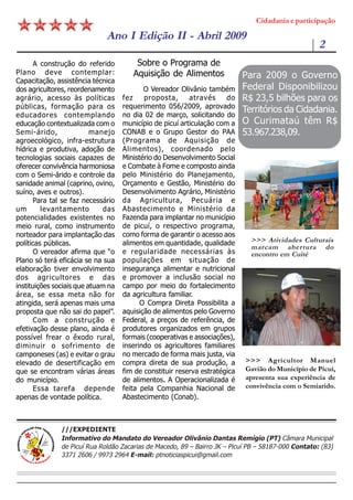 O documento discute as ações do vereador Olivânio Dantas para promover o desenvolvimento da região do Curimataú na Paraíba. Ele se reuniu com o presidente Lula para discutir o programa Territórios da Cidadania, que agora inclui a região do Curimataú. O vereador também propôs a criação de um Plano Municipal de Desenvolvimento Agrário em Picuí para apoiar os agricultores locais.