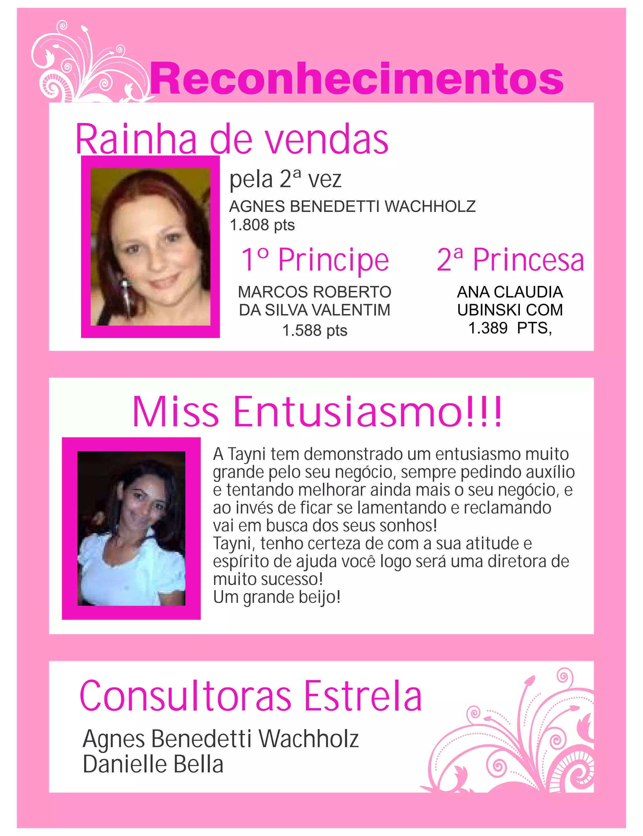 Agnes Benedetti Wachholz foi novamente a rainha de vendas com 1.808 pontos. Marcos Roberto da Silva Valentim ficou em 1o lugar com 1.588 pontos e Ana Claudia Ubinski em 2o com 1.389 pontos. O documento também apresenta desafios de vendas e reconhecimentos para o mês de abril.