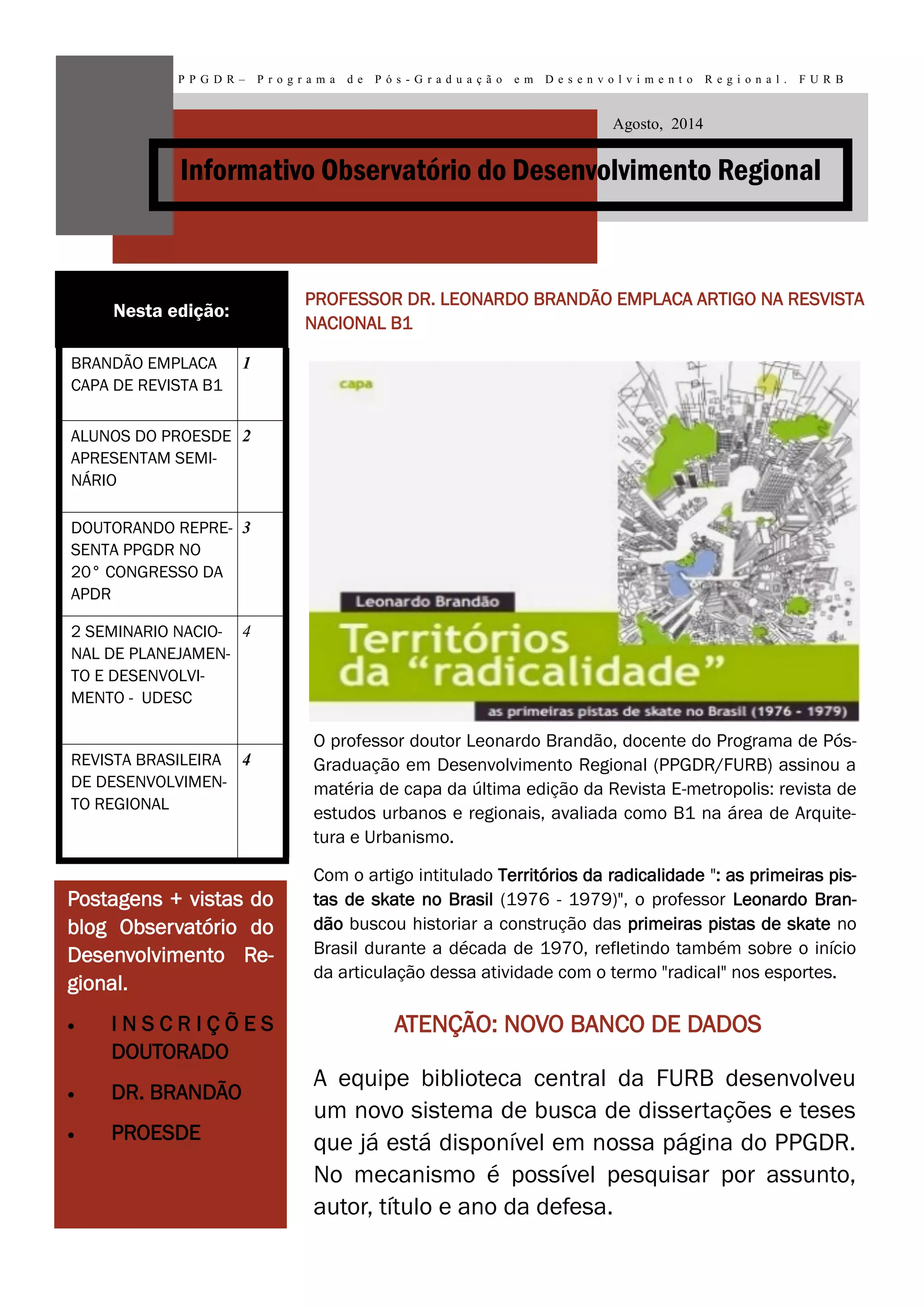 O documento resume notícias e eventos do Programa de Pós-Graduação em Desenvolvimento Regional da FURB, incluindo um professor que publicou artigo de capa em revista, alunos que apresentaram seminário, e doutorando que representou o programa em congresso em Portugal.