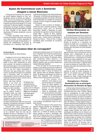 1) O boletim informa sobre o lançamento de um livro que conta a história do Projeto Fecundação, um projeto da Cáritas Brasileira Regional do Piauí que melhorou as condições de vida das famílias de Coronel José Dias.