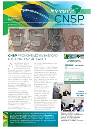 O documento discute três Propostas de Emenda Constitucional (PECs) que afetam servidores públicos: a PEC 555/2006, que extingue a contribuição previdenciária de aposentados; a PEC 219/2012, que permite acumulação de cargos de professor e administrativo; e a PEC 170/2012, que busca resgatar a aposentadoria integral por invalidez. A CNSP promoveu atos públicos em São Paulo para defender essas pautas e coletar assinaturas para votação das PECs no Congresso.