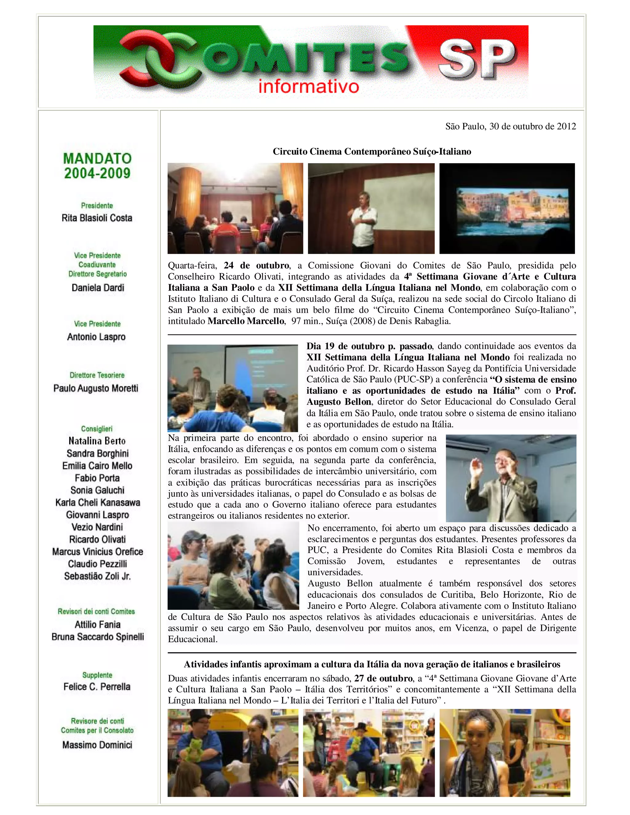 O documento resume vários eventos culturais realizados em São Paulo, incluindo exibições de filmes suíços e italianos, conferências sobre o sistema educacional italiano, atividades infantis para aproximar a cultura italiana de crianças, concertos musicais, jantares dançantes e a abertura de uma exposição de arte.