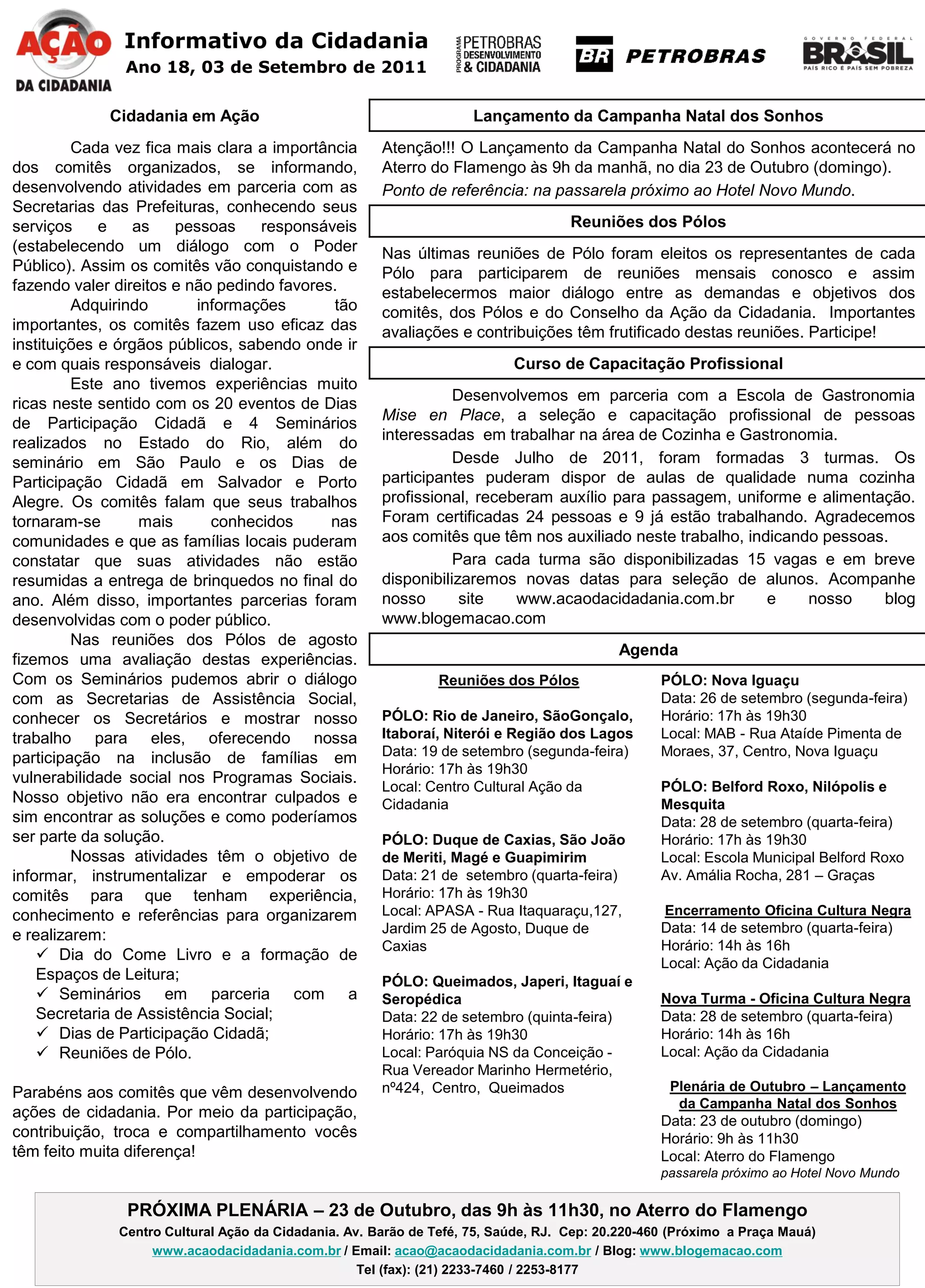 O documento anuncia (1) o lançamento da Campanha Natal dos Sonhos no Aterro do Flamengo em 23 de outubro, (2) reuniões dos Pólos para estabelecer diálogo entre demandas e objetivos, e (3) a formação de 3 turmas em curso de capacitação profissional com 24 pessoas certificadas e 9 já empregadas.