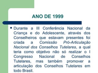 O documento descreve a história da criação e desenvolvimento do Fórum Colegiado Nacional de Conselheiros Tutelares (FCNCT) no Brasil. O FCNCT foi criado em 2001 durante o I Congresso Nacional de Conselhos Tutelares para promover a articulação entre os Conselhos Tutelares dos estados brasileiros. Desde então, vem conquistando avanços como a regulamentação da função do conselheiro tutelar e a participação em debates nacionais sobre políticas de proteção à criança e ao adolescente.