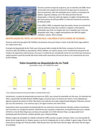 1) O Rio Tietê, apesar de ser o maior rio de São Paulo, está altamente poluído e considerado "morto" na região metropolitana devido ao despejo de esgoto. 2) O Projeto Tietê foi criado em 1992 para limpar o rio, mas já custou R$8,1 bilhões e ainda faltam R$4 bilhões para conclusão. 3) Mesmo com investimentos, o rio continua poluído e é preciso mais ações de saneamento básico e conscientização da população para sua revitalização