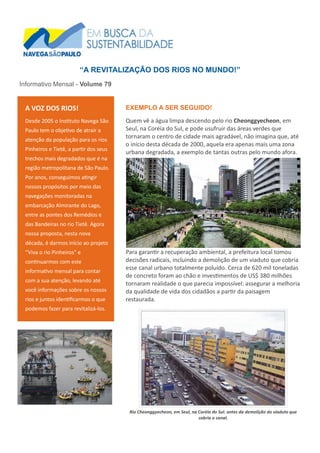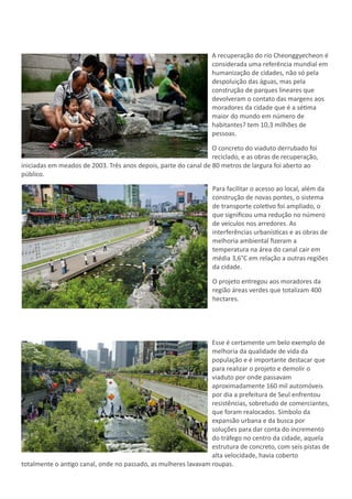 O documento discute a revitalização do rio Cheonggyecheon em Seul através da demolição de um viaduto, criando parques lineares. Também aborda projetos para revitalizar os rios Pinheiros e Tietê em São Paulo, destacando os desafios complexos relacionados a problemas sociais.