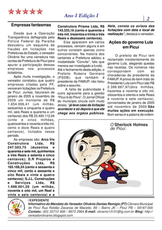 O documento descreve as péssimas condições do transporte escolar para estudantes universitários em Picuí, com o ônibus em estado de sucateamento. Relata também que, apesar de financiamento disponível, a prefeitura não realizou melhorias. Aponta que empresas fantasmas venceram licitações na prefeitura, contrariando investigação da Polícia Federal, e que o prefeito alugou carros de luxo com verba da saúde.