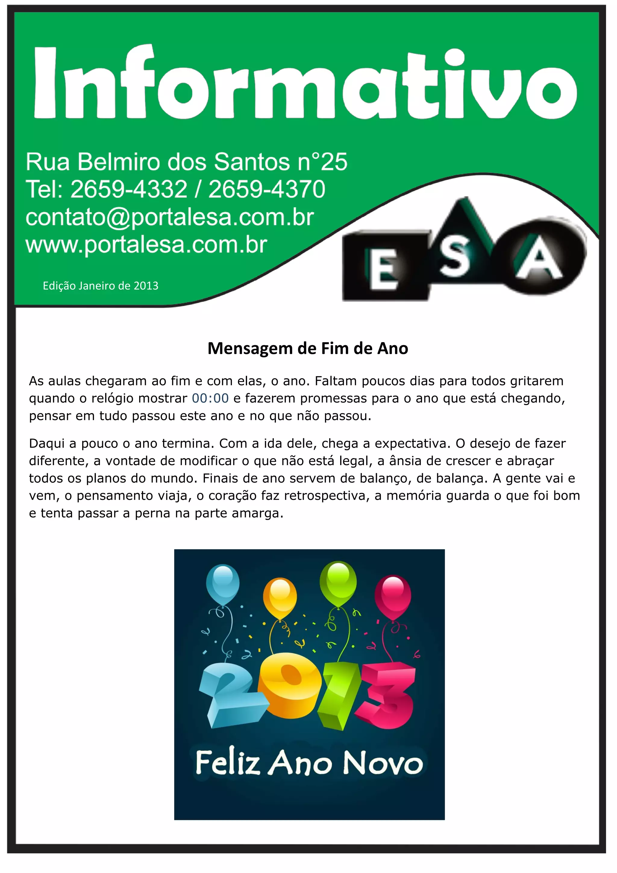 O texto fala sobre o fim do ano letivo e do ano que está chegando ao fim, com alunos fazendo balanços e planos para o próximo ano, enquanto aguardam a virada de ano. Também convida leitores a se matricularem na escola.