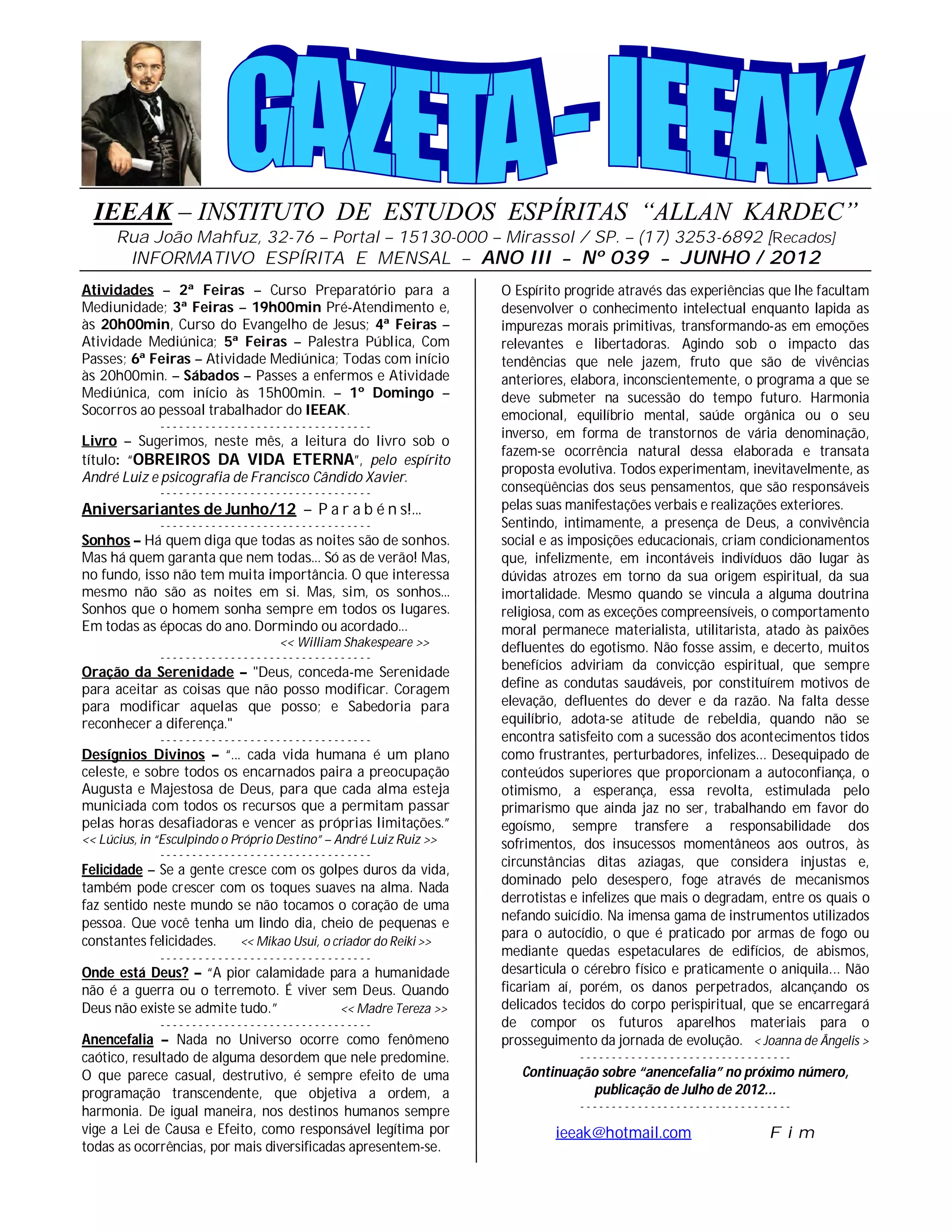 Este boletim mensal fornece informações sobre as atividades espíritas realizadas em um instituto, recomendações de livros, aniversariantes, citações e reflexões sobre sonhos, oração, destino divino e felicidade. Também discute os temas de Deus, anencefalia e suicídio.