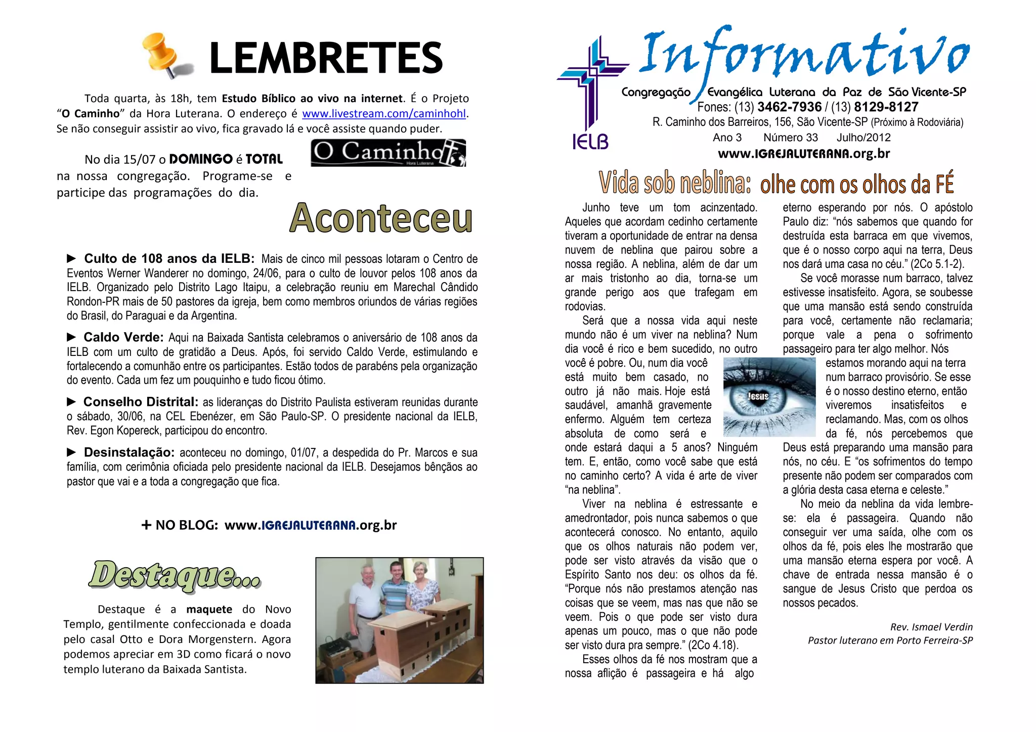 2) No dia 15/07 haverá um evento na congregação evangélica luterana.