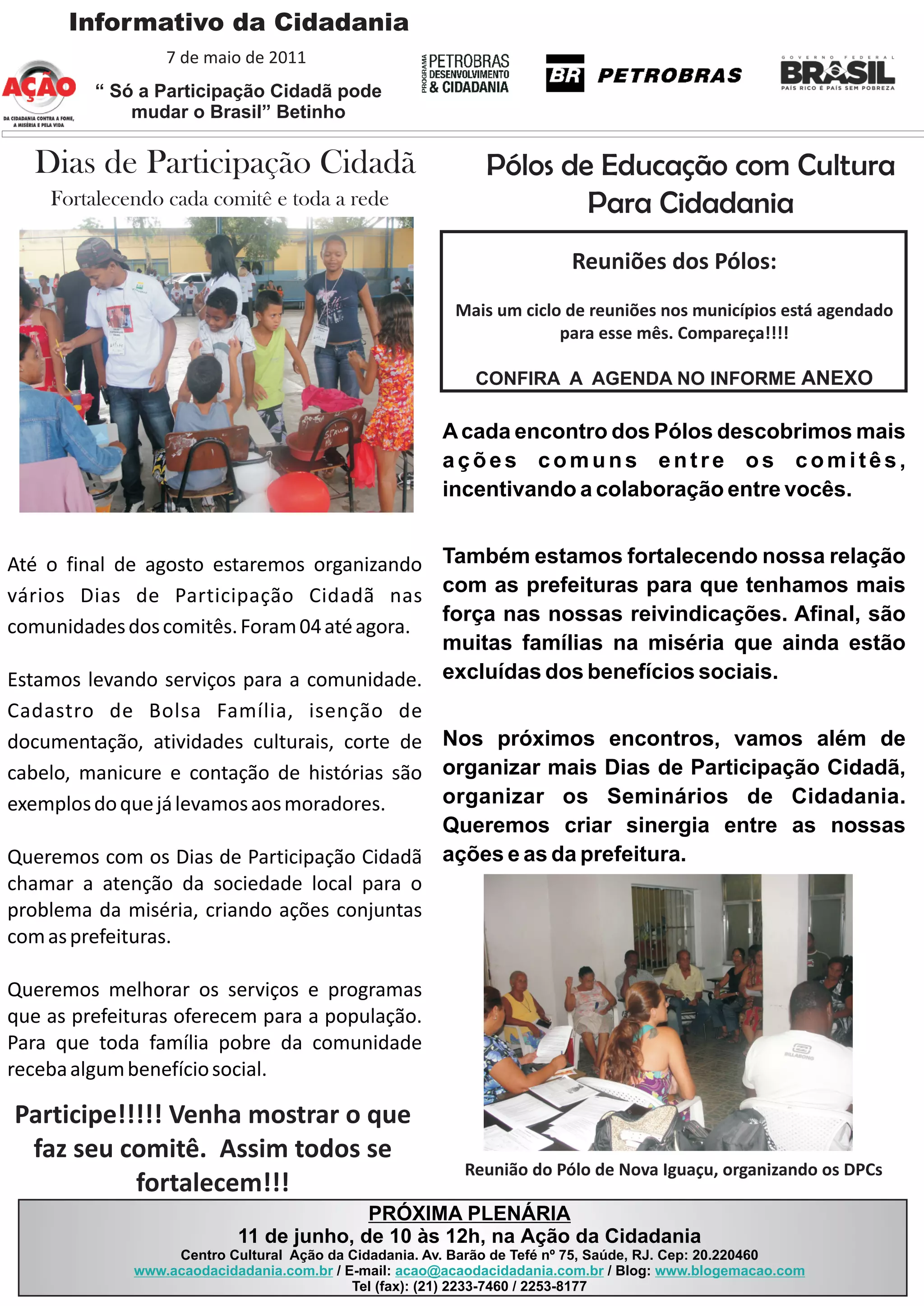 O documento convoca os membros dos comitês a participarem de reuniões dos Pólos de Educação com Cultura para a Cidadania em maio. Também anuncia que até agosto serão organizados vários Dias de Participação Cidadã para levar serviços às comunidades e chamar a atenção para o problema da miséria. Além disso, nos próximos encontros serão organizados Seminários de Cidadania para criar sinergia entre as ações dos comitês e da prefeitura.