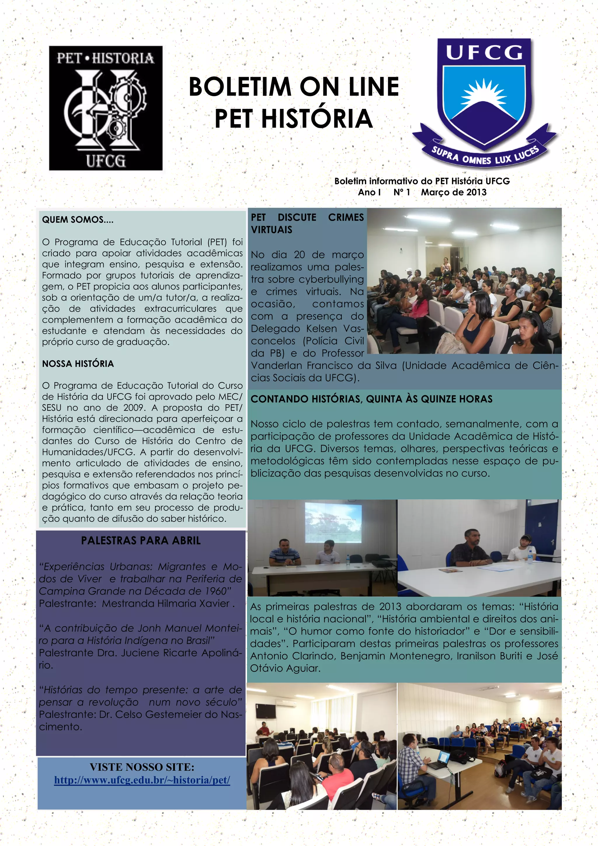 O Programa de Educação Tutorial (PET) foi criado para apoiar atividades acadêmicas que integram ensino, pesquisa e extensão. O PET História da UFCG realiza atividades como palestras, oficinas de leitura e divulgação de pesquisas para complementar a formação dos estudantes de história.