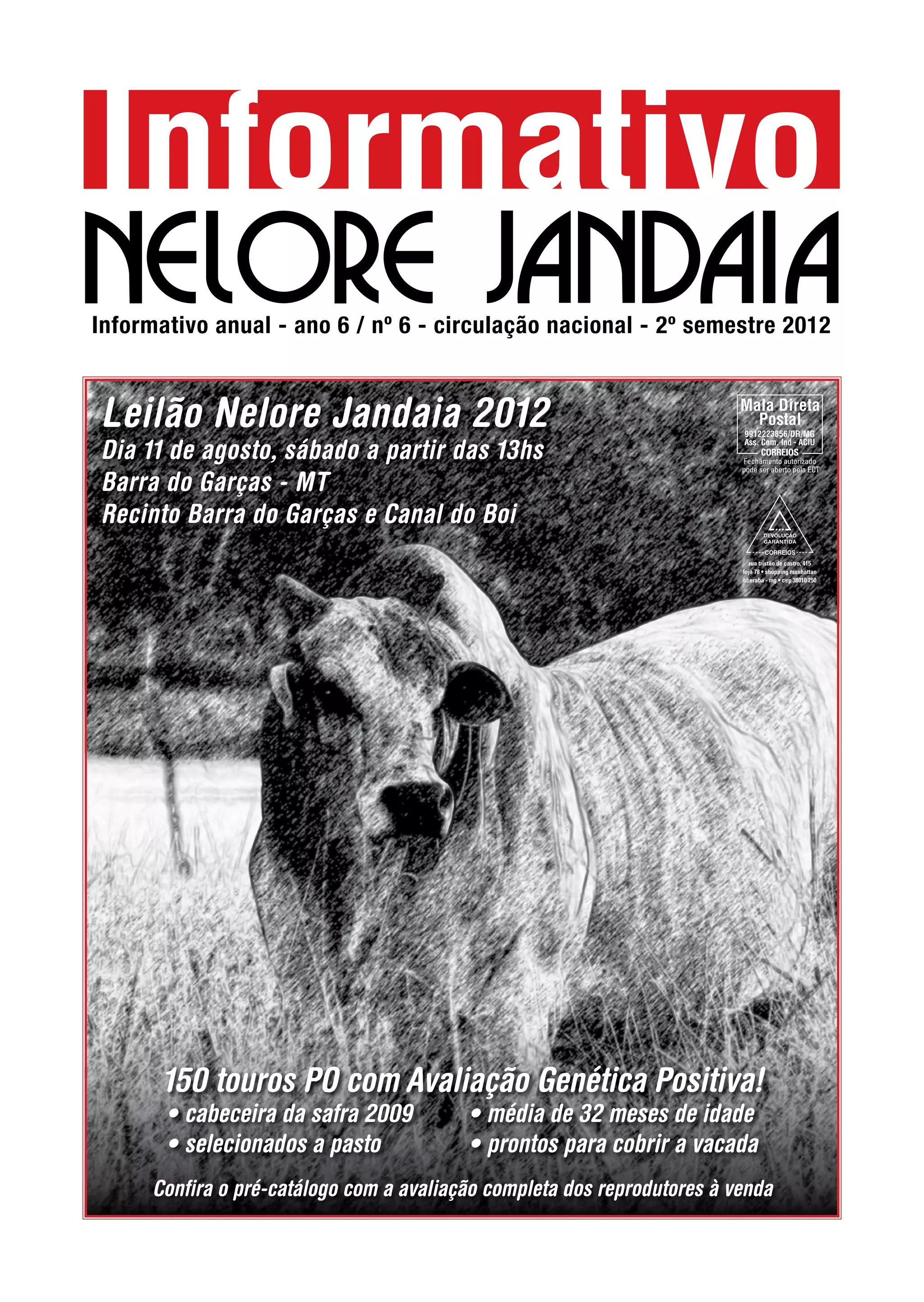 Este documento é um informativo anual da marca Nelore Jandaia que resume: 1) A história de melhoramento genético da marca ao longo de quase 50 anos, com foco em características de produção de carne a pasto; 2) A seleção de 4 novos touros identificados a pasto que terão sêmen disponível em banco de germoplasma; 3) As avaliações genéticas e fenotípicas desses touros.