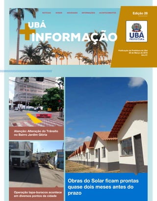 O documento resume as principais notícias da Prefeitura de Ubá na semana, incluindo a conclusão antecipada das obras do Residencial Solar, a realização de ações em comemoração ao Dia Mundial da Água, e a programação da Semana da Juventude que começa na segunda-feira.