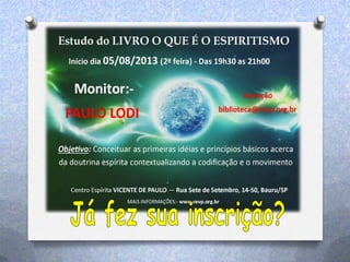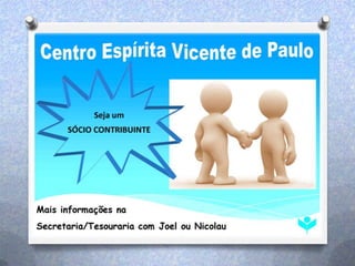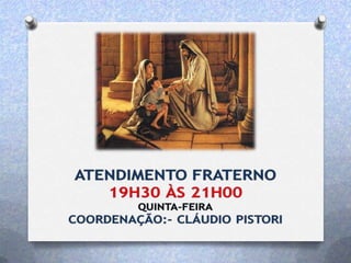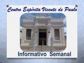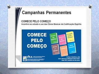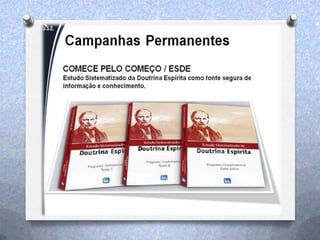 Este documento fornece informações sobre os programas educacionais e de assistência de um departamento espírita. Ele lista as idades atendidas pela educação espírita infantil-juvenil e fornece detalhes sobre palestras, cursos, grupos de estudo e atividades de assistência a famílias, como distribuição de cestas básicas. Também convida para voluntariado em artesanato, doações de alimentos e associação ao clube do livro.