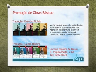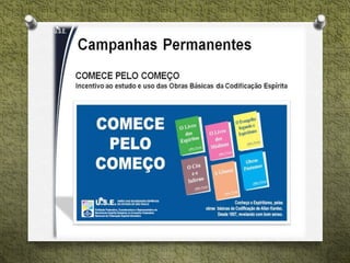 O documento descreve as atividades educacionais e assistenciais de um departamento espírita infantojuvenil, incluindo cursos, palestras, aplicação de passes magnéticos e grupos de estudo para diferentes faixas etárias, além de projetos assistenciais como distribuição de cestas básicas e oficinas para famílias. Informa também sobre voluntariado, doações, clube do livro e contatos.