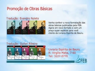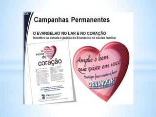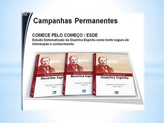 O documento descreve as atividades educacionais e de assistência social oferecidas pelo Departamento de Educação Espírita Infanto Juvenil e pelo Departamento de Orientação e Assistência às Famílias, incluindo palestras, estudos de livros, passe magnético, oficinas, alfabetização e distribuição de cestas básicas.