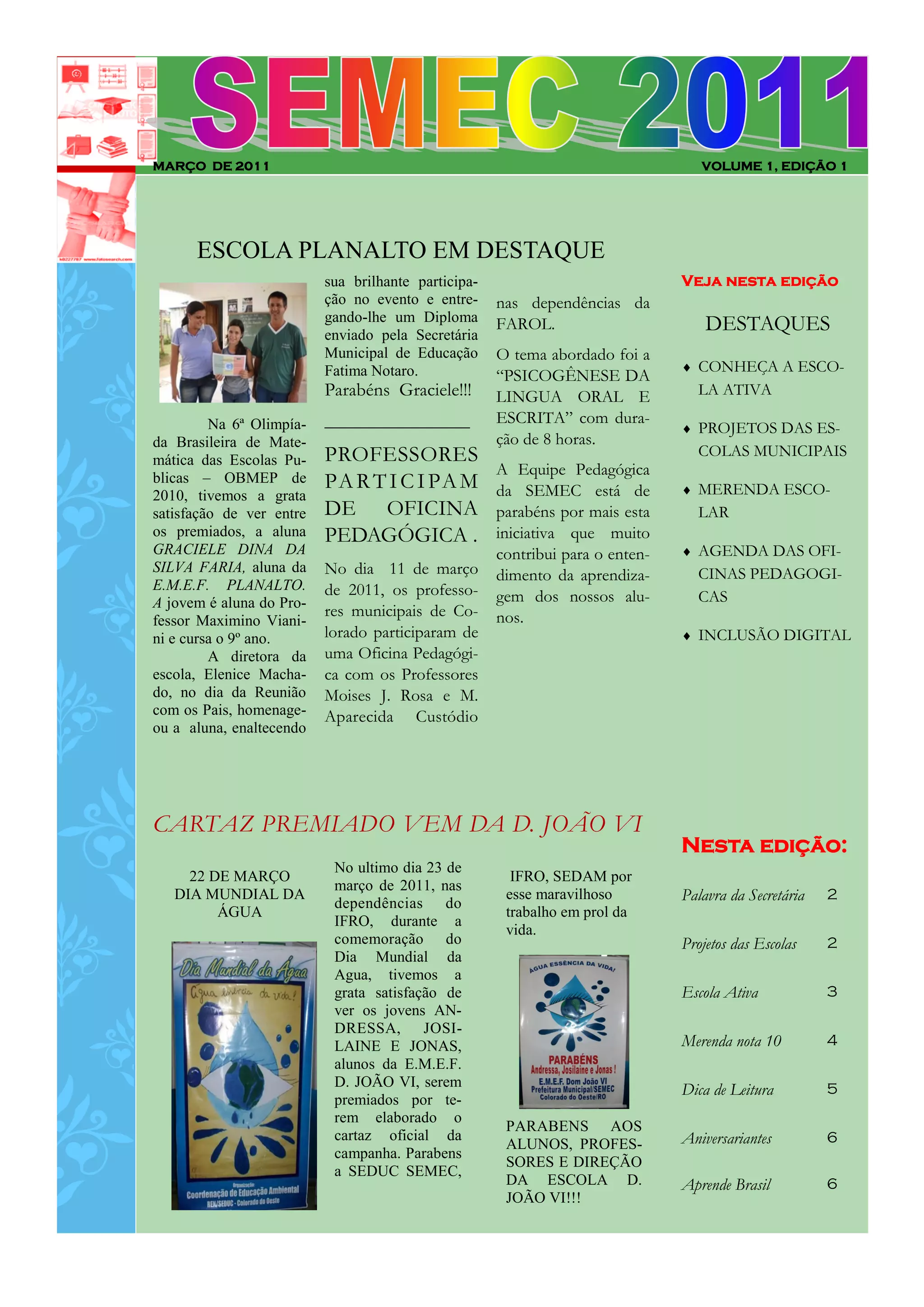 1) O documento apresenta destaque para a participação de alunos da Escola Planalto em eventos de matemática e ciências.
