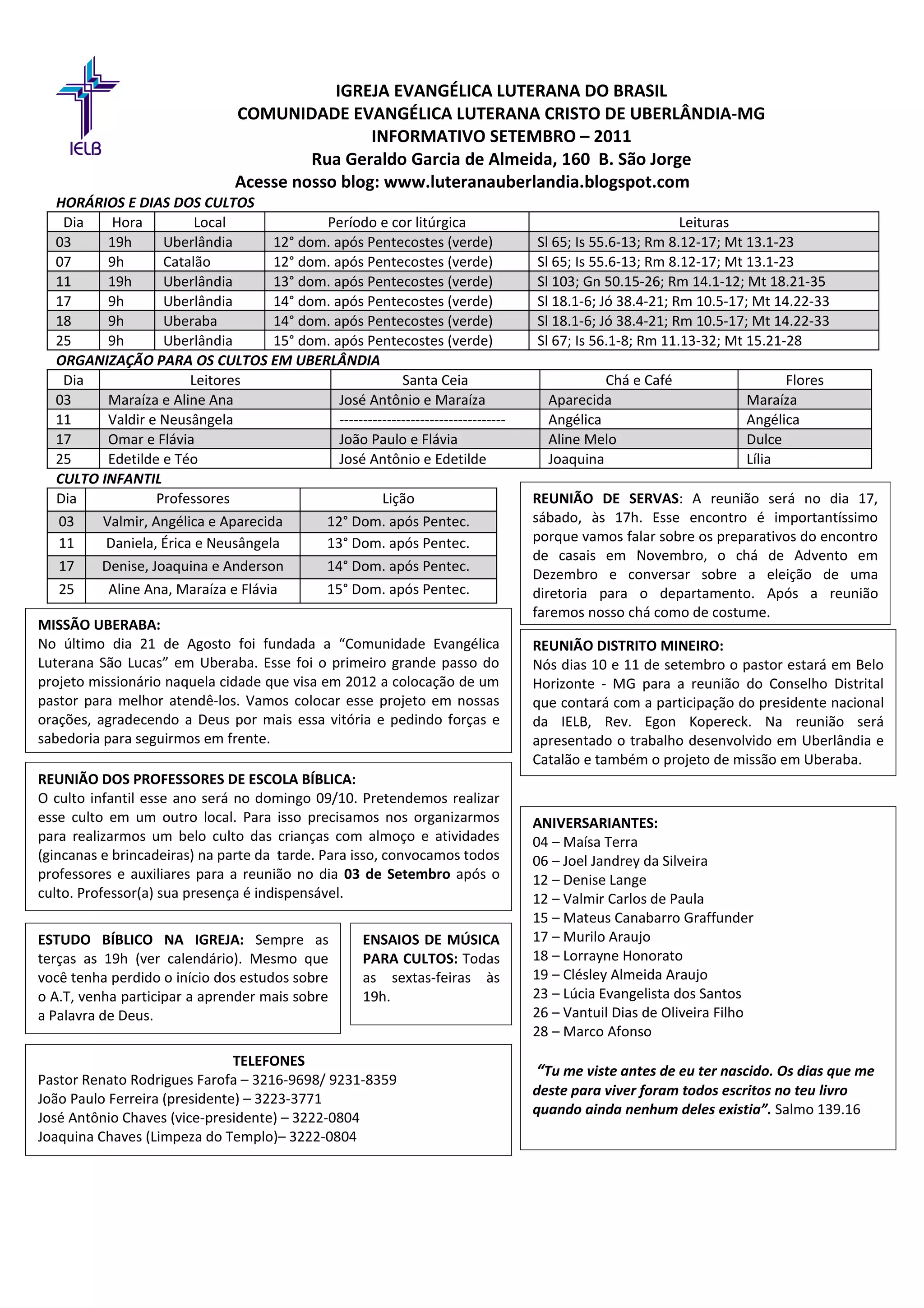 O documento fornece o calendário de cultos e atividades da Igreja Evangélica Luterana do Brasil em Uberlândia para o mês de setembro de 2011, incluindo datas e horários dos cultos, leituras bíblicas, organização de tarefas, projetos missionários e aniversariantes.