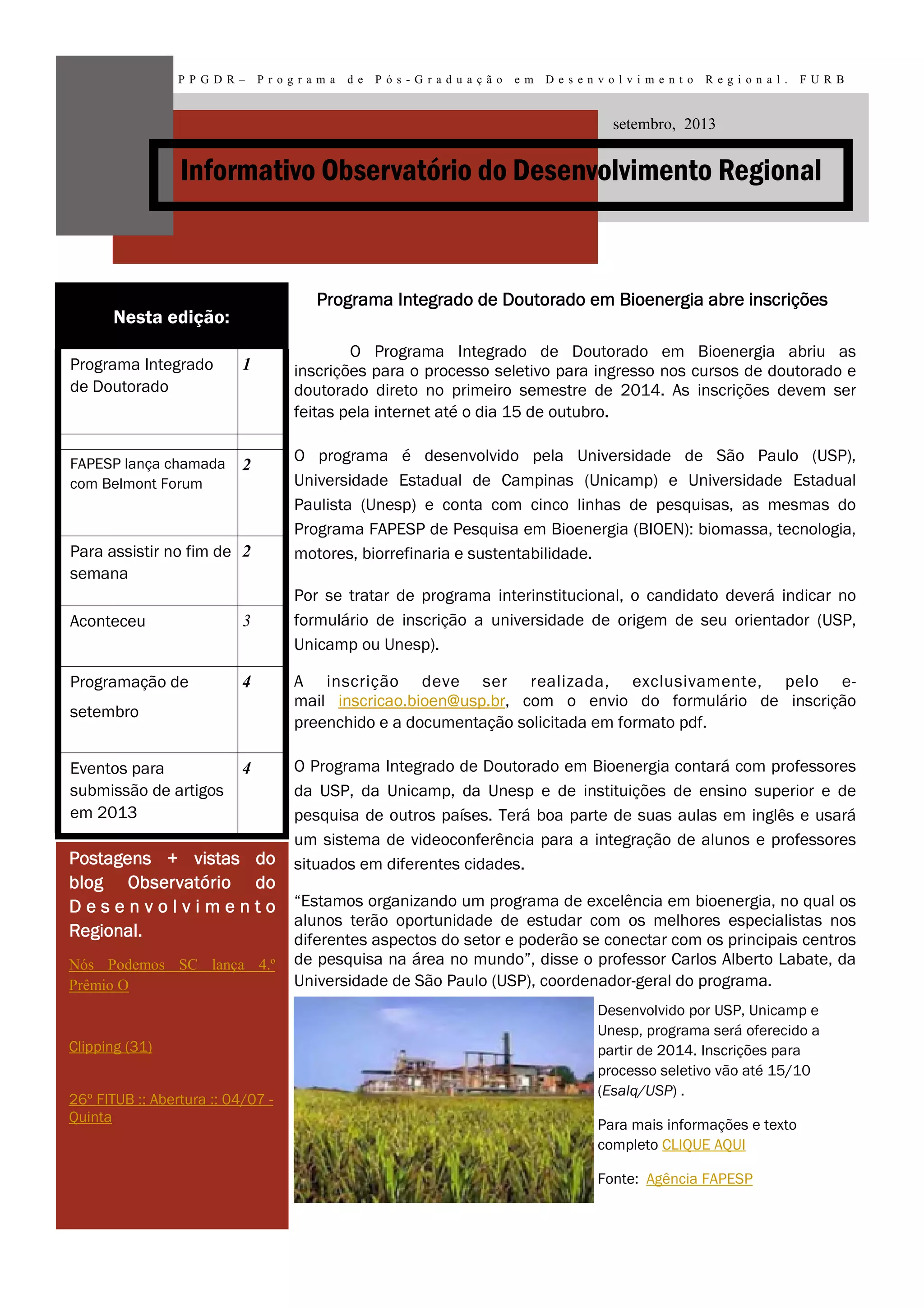 O documento discute três tópicos principais: 1) O lançamento de uma chamada para inscrições no Programa Integrado de Doutorado em Bioenergia até 15 de outubro, que é um programa interinstitucional entre USP, Unicamp e Unesp; 2) A FAPESP lançando uma chamada conjunta com o Belmont Forum para projetos de pesquisa sobre segurança alimentar e uso da terra; 3) Eventos acadêmicos relacionados a desenvolvimento regional ocorridos em setembro, incluindo o 6o Seminário Internacional