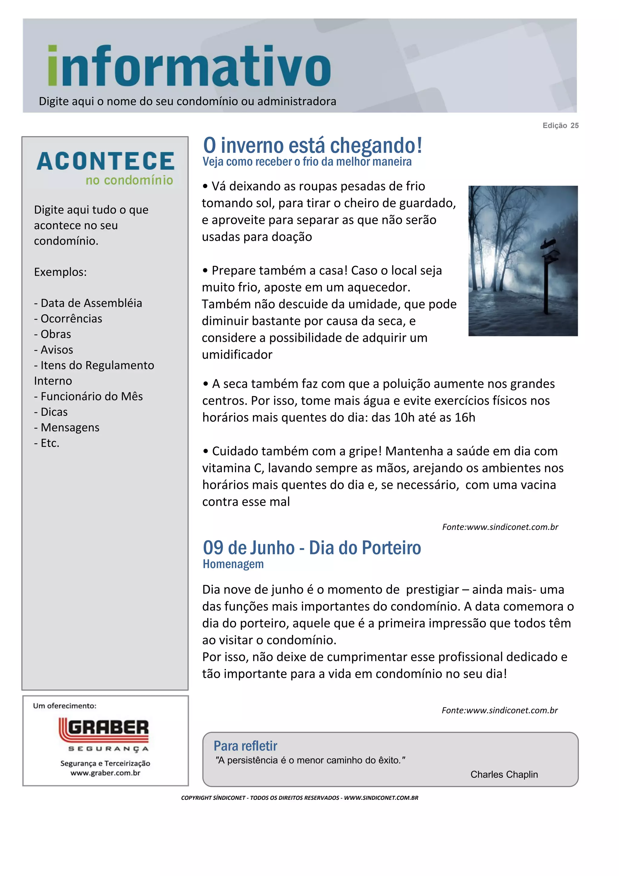 O documento fornece dicas para se preparar para o inverno, como deixar roupas de frio arejando para tirar o cheiro de guardado e separar as que não serão usadas para doação. Também recomenda preparar a casa com aquecedor caso seja fria e usar umidificador para combater a seca, que aumenta a poluição. Cuidados com a saúde como tomar vitaminas também são destacados. O texto também celebra o Dia do Porteiro e sua importância no condomínio.
