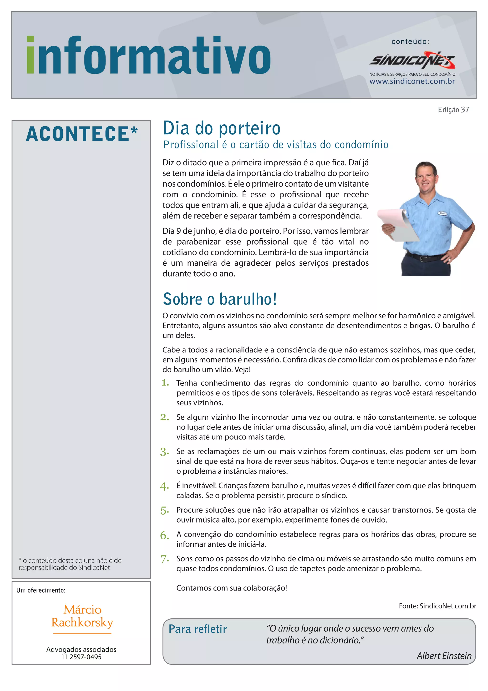 O documento celebra o Dia do Porteiro e destaca a importância do trabalho desse profissional no condomínio. Também discute dicas para lidar com problemas de barulho entre vizinhos, enfatizando a necessidade de diálogo e respeito às regras estabelecidas.