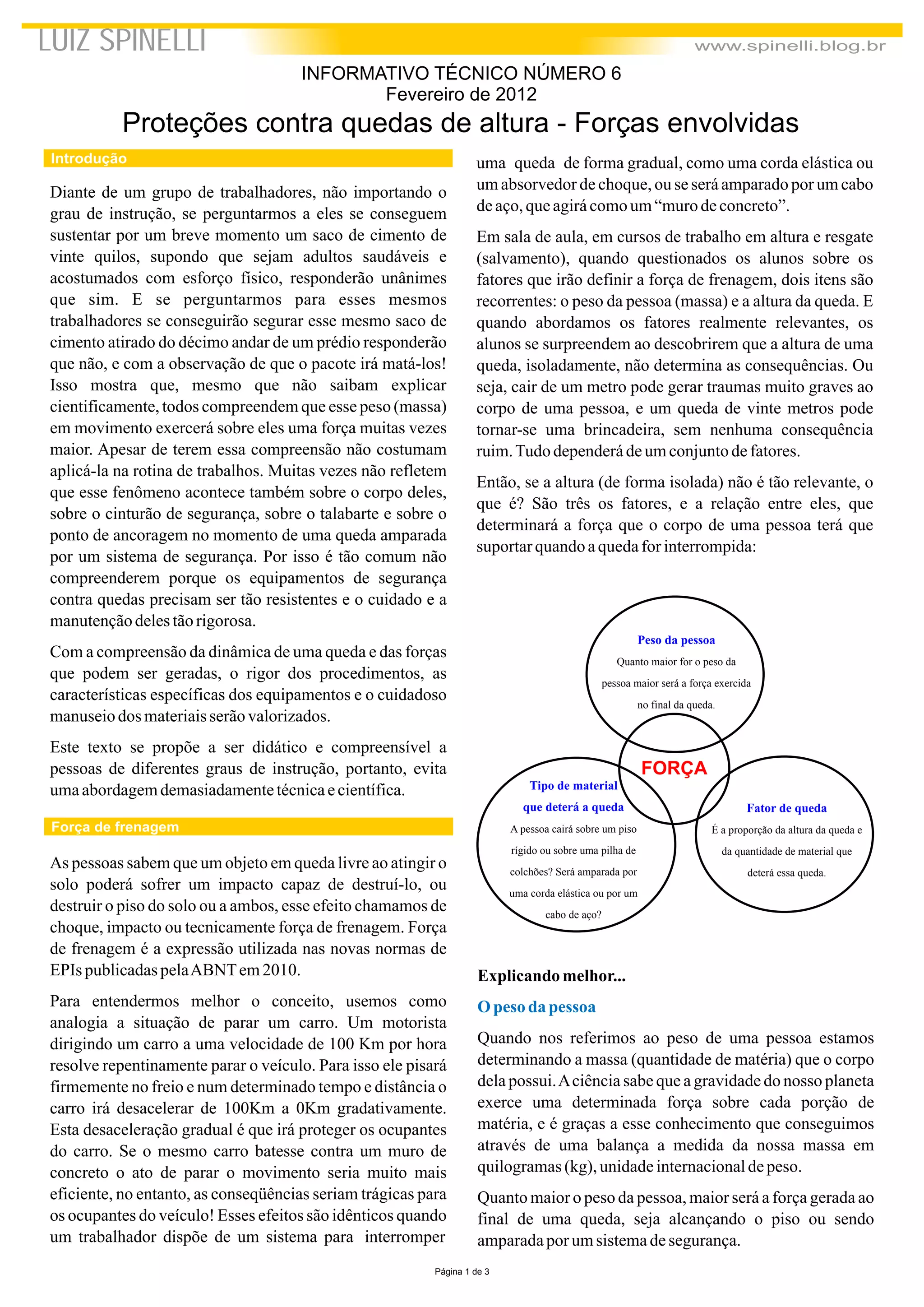 Este documento discute as forças envolvidas em quedas de altura e como elas dependem de três fatores: o peso da pessoa, o tipo de material que deterá a queda, e o fator de queda. Explica que o fator de queda é calculado pela relação entre a altura da queda e a quantidade de material que a deterá, e deve ser menor que 1 para garantir a segurança.