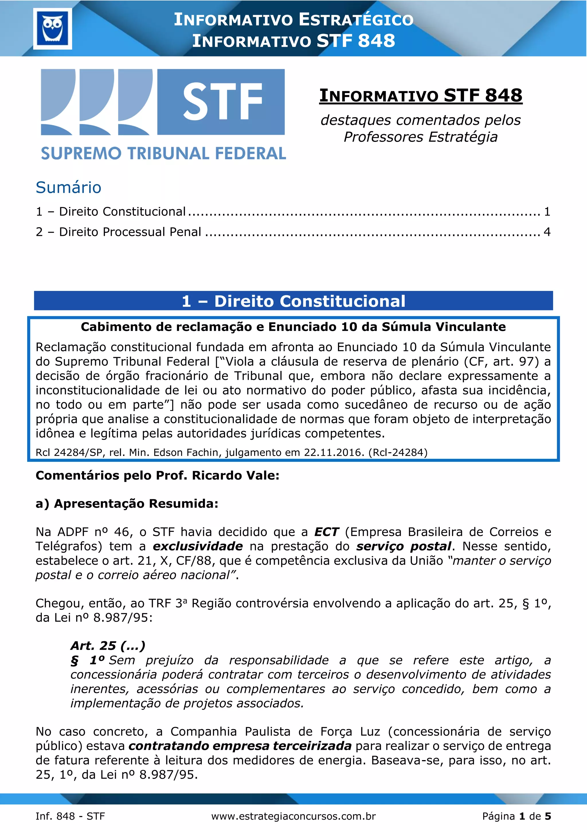 O Informativo STF 848 aborda questões relevantes em direito constitucional e processual penal, analisando decisões importantes do Supremo Tribunal Federal. Destaca-se a interpretação da cláusula de reserva de plenário e a obrigação de repasse de duodécimos ao poder judiciário, mesmo em situações de frustração orçamentária. Além disso, o documento discute a garantia da razoável duração do processo no contexto de habeas corpus, enfatizando que atrasos excessivos podem constituir constrangimento ilegal.