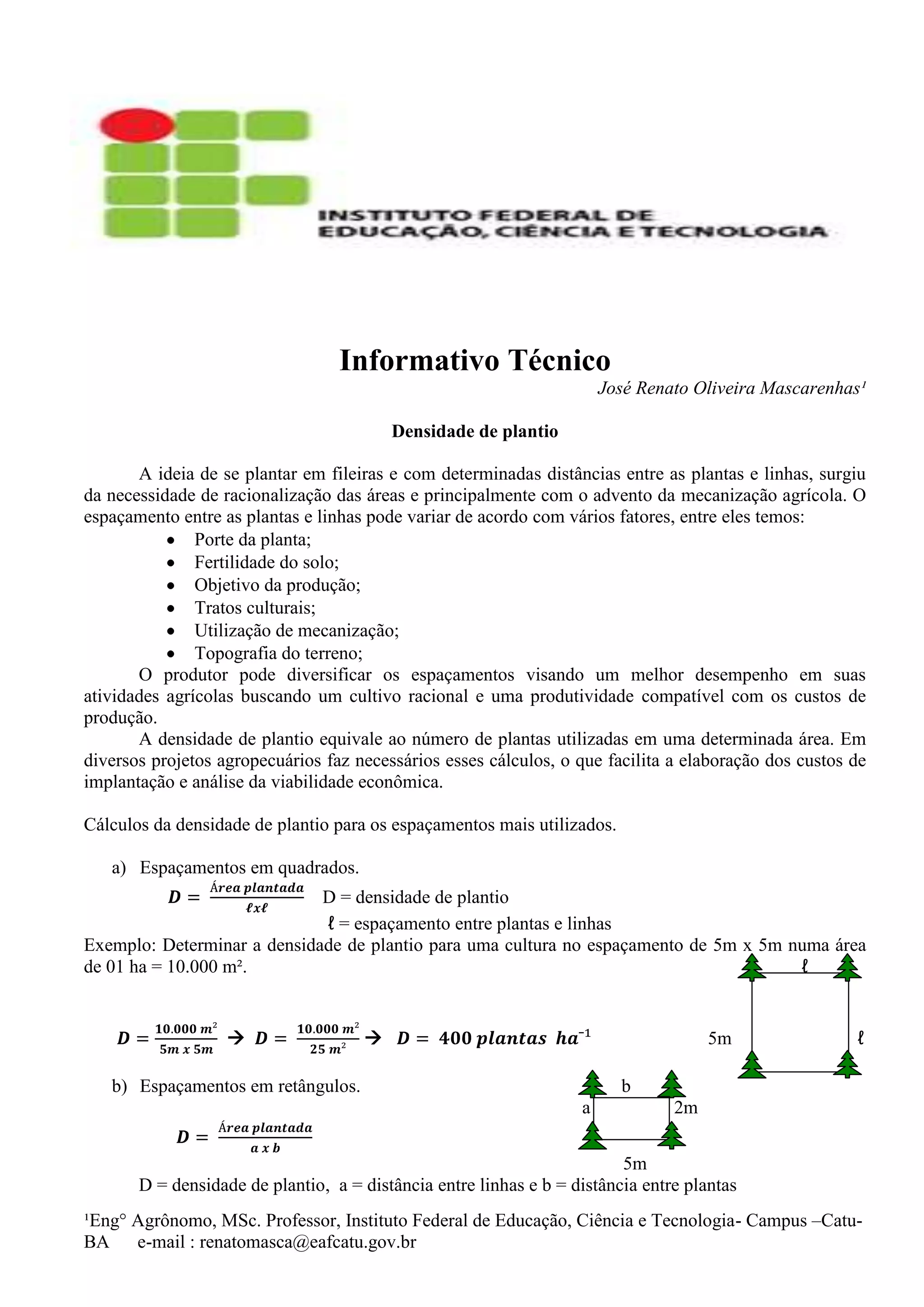 O documento discute diferentes métodos para calcular a densidade de plantio de acordo com o espaçamento entre as plantas, incluindo espaçamentos em quadrados, retângulos, triângulos, e fileiras duplas. Fornece fórmulas e exemplos para calcular a densidade de plantio para cada tipo de espaçamento em uma área de 1 hectare.