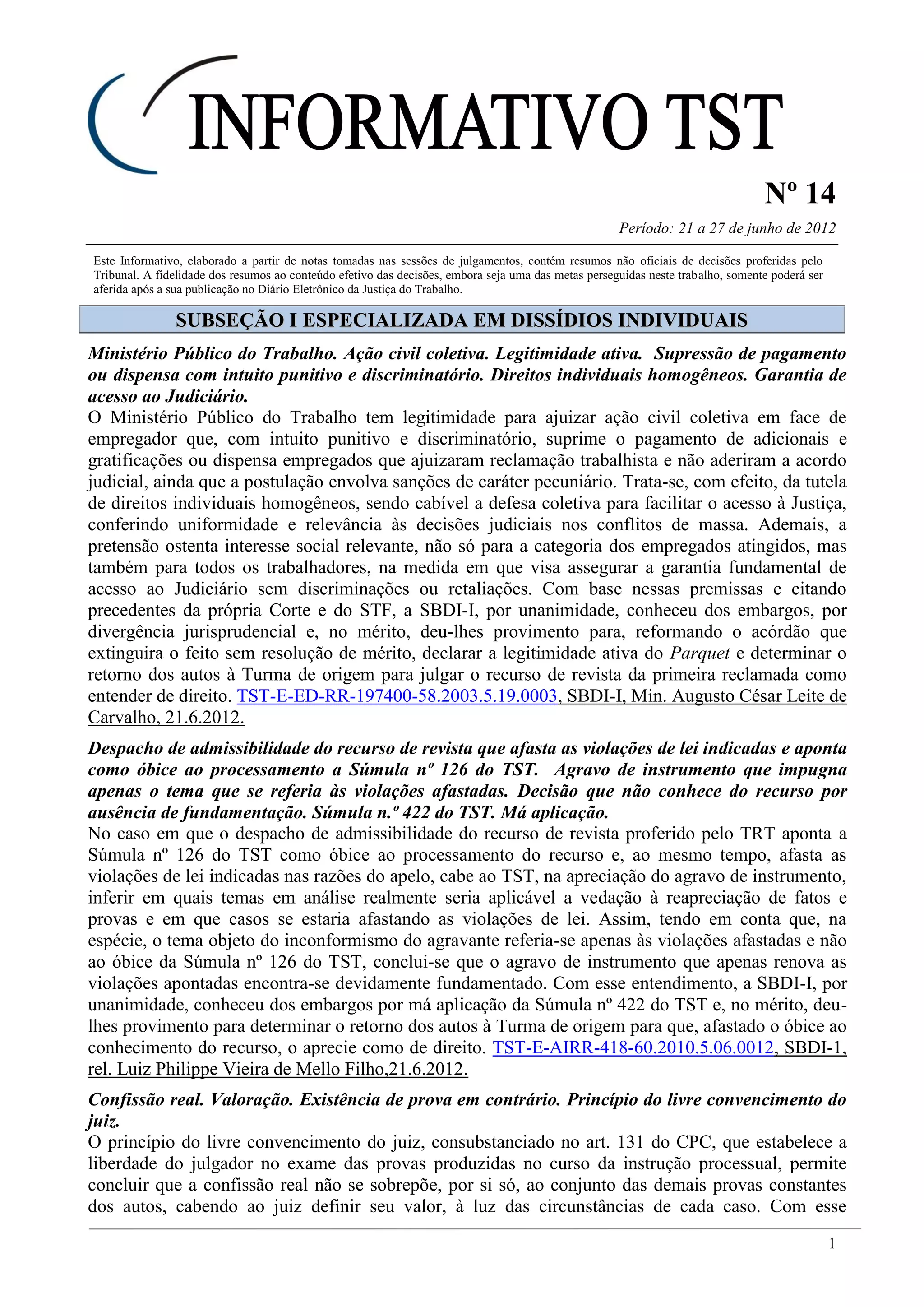 O Ministério Público do Trabalho tem legitimidade para mover ação coletiva contra empregador que puna ou demita empregados que entraram com processos trabalhistas. A SBDI-I reformou decisão que extinguira processo sem julgamento do mérito e determinou o retorno à Turma de origem. O agravo de instrumento que renova violações apontadas está devidamente fundamentado, e o TST deve analisá-lo. A confissão não se sobrepõe necessariamente a outras provas, cabendo ao juiz defin
