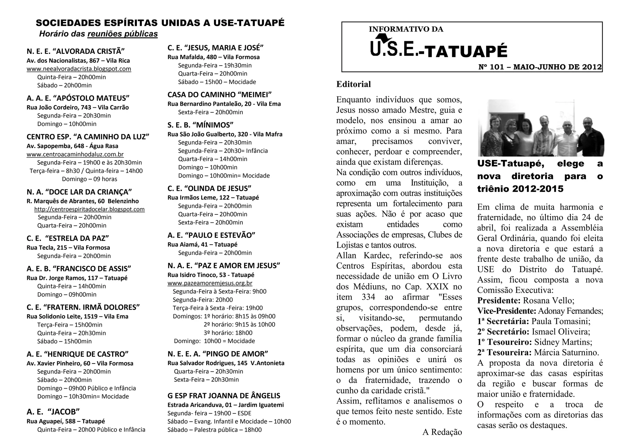 1) A 44a Semana da Juventude Espírita de Tatuapé (SEJEST) ocorrerá de 16 a 22 de julho com palestras noturnas em diferentes casas espíritas sobre os precursores, filhos de Deus, reveladores e consoladores.