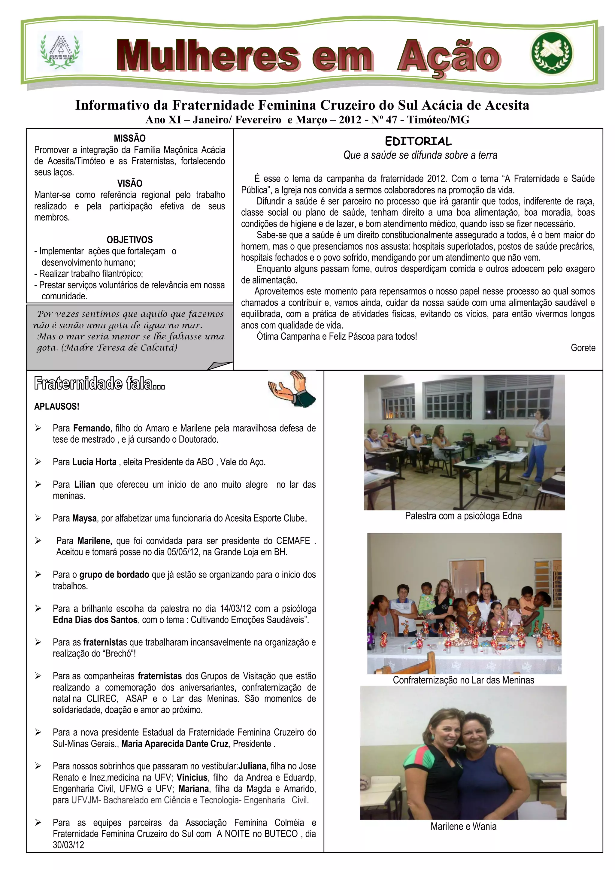 O documento resume as atividades e aniversariantes da Fraternidade Feminina Cruzeiro do Sul Acácia de Acesita para os meses de janeiro a março de 2012, incluindo uma palestra sobre emoções saudáveis e comemorações de aniversários e eventos de solidariedade.